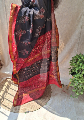 Ajrakh Print Handblock Maheshwari Silk Saree with Unstitched Blouse Piece