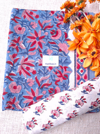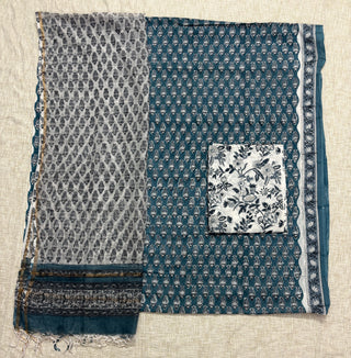 Blue Cotton Handblock Office Wear Suit fabric with Kota Doria Dupatta