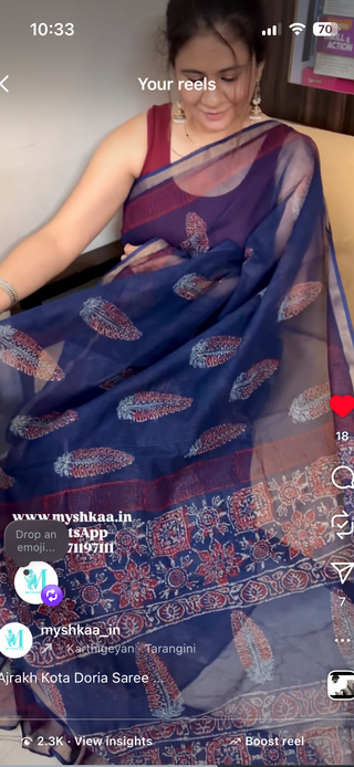 Ajrakh Hand Block Print Kota Doria Cotton Saree with zari border and unstitched Blouse Piece