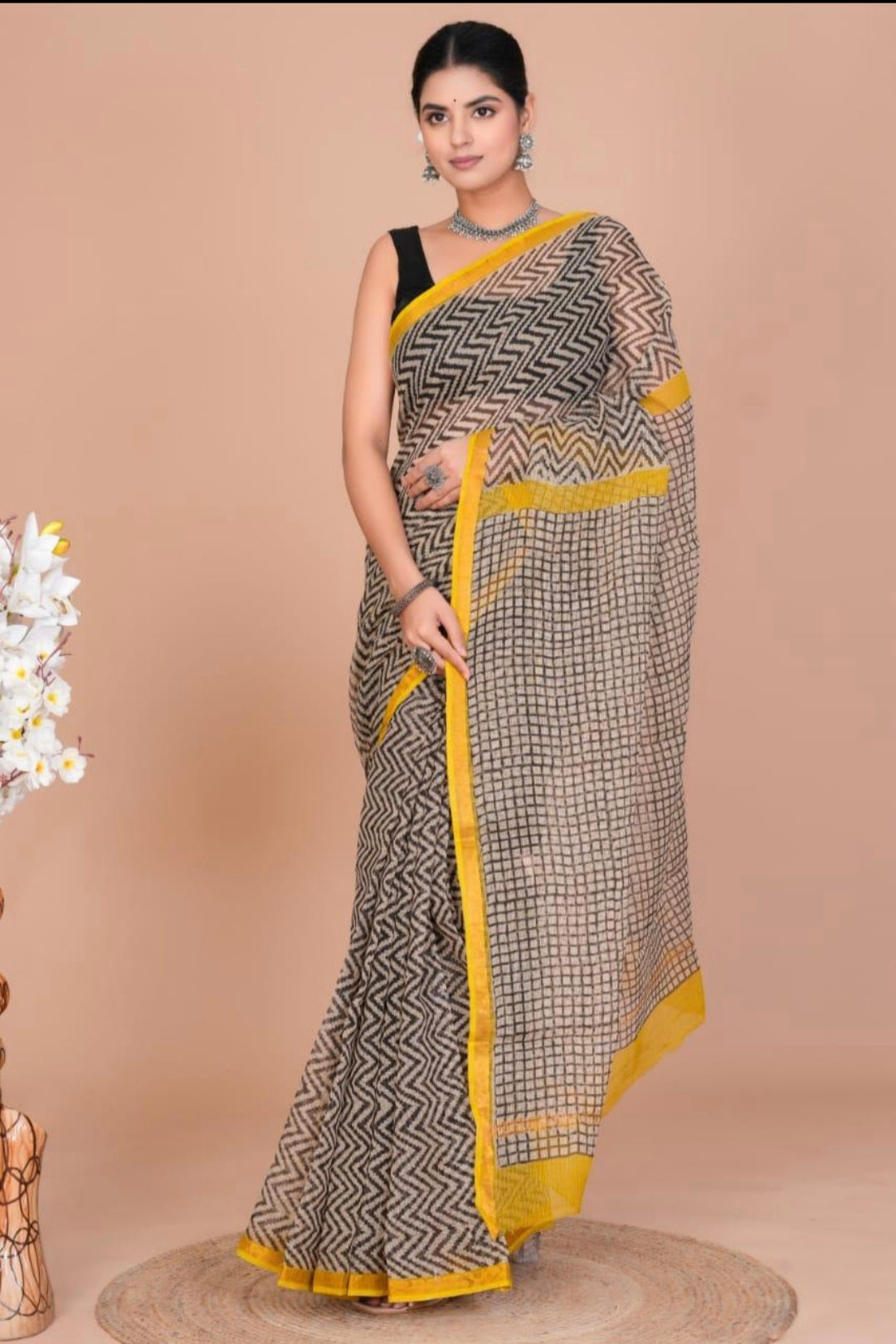 Black Stripes Hand Block Print Kota Doria Cotton Saree with zari border and unstitched Blouse Piece