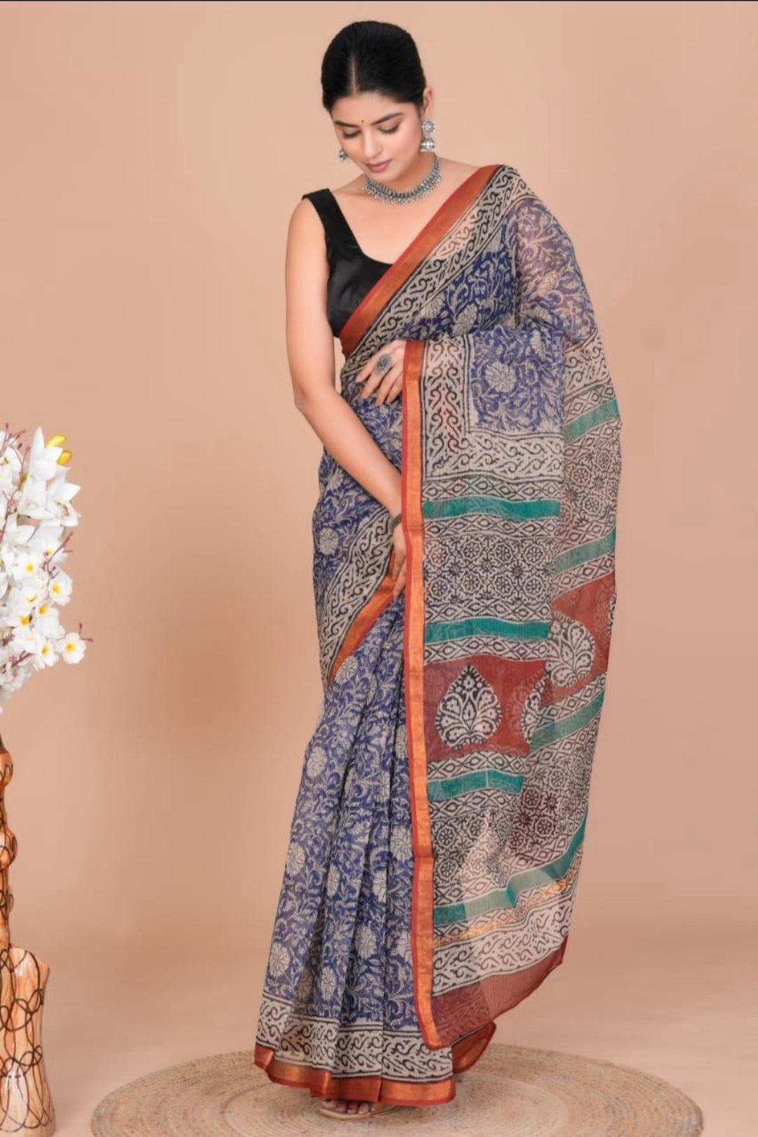 Blue Hand Block Print Kota Doria Cotton Saree with zari border and unstitched Blouse Piece