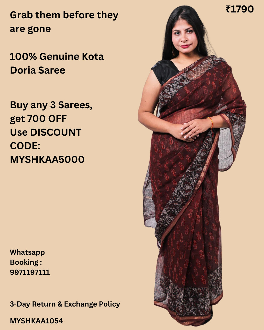 Burgundy Hand Block Printed Kota Doria Cotton Saree with Unstitched Blouse Piece