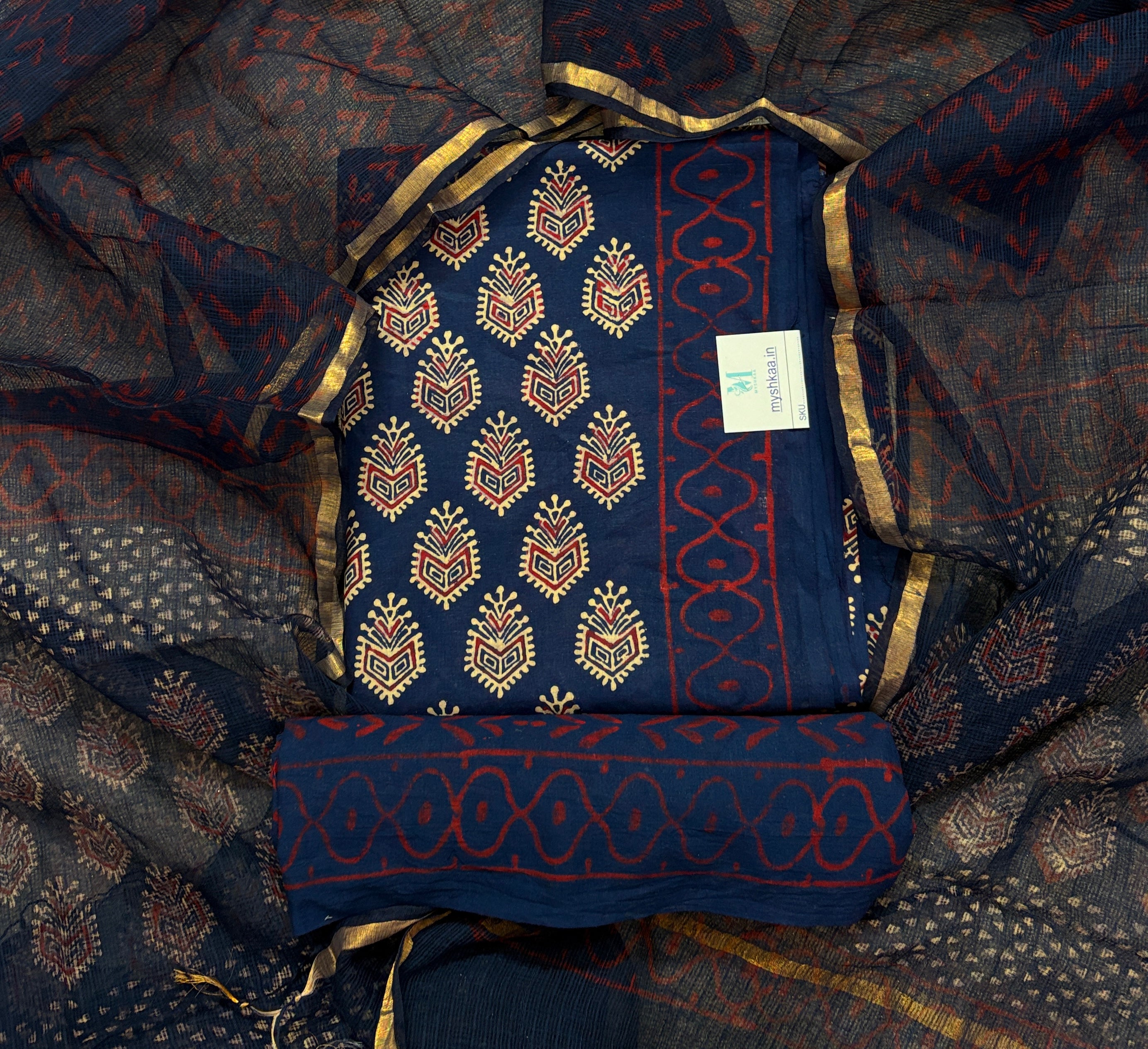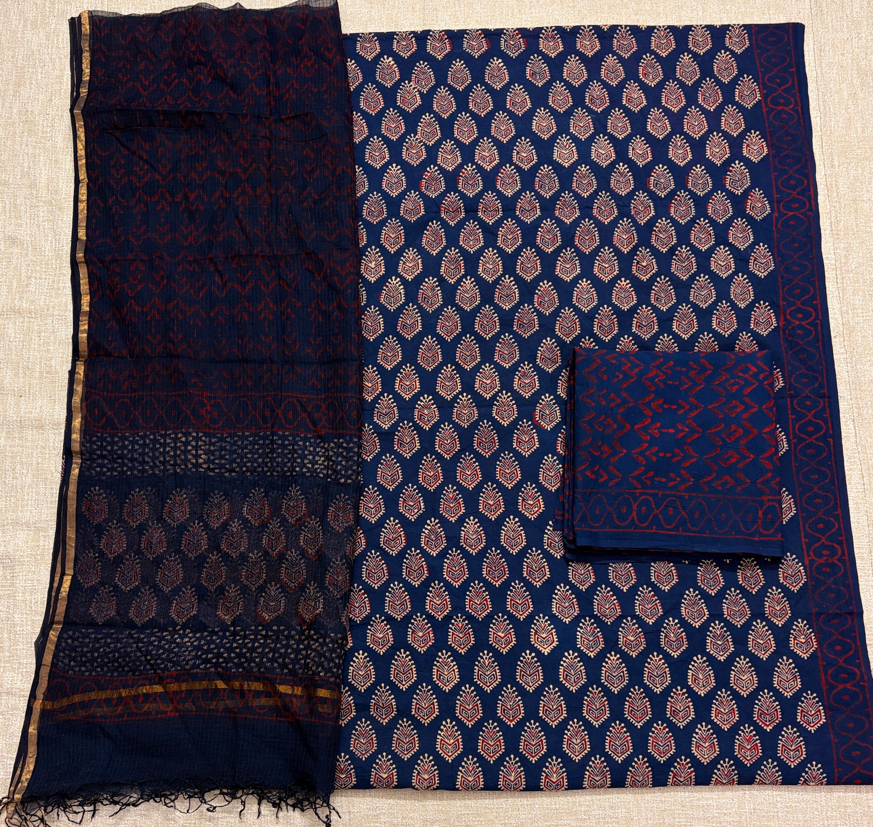 Ajrakh Print Cotton Handblock Office Wear Suit fabric with Kota Doria Dupatta (Code : 987)
