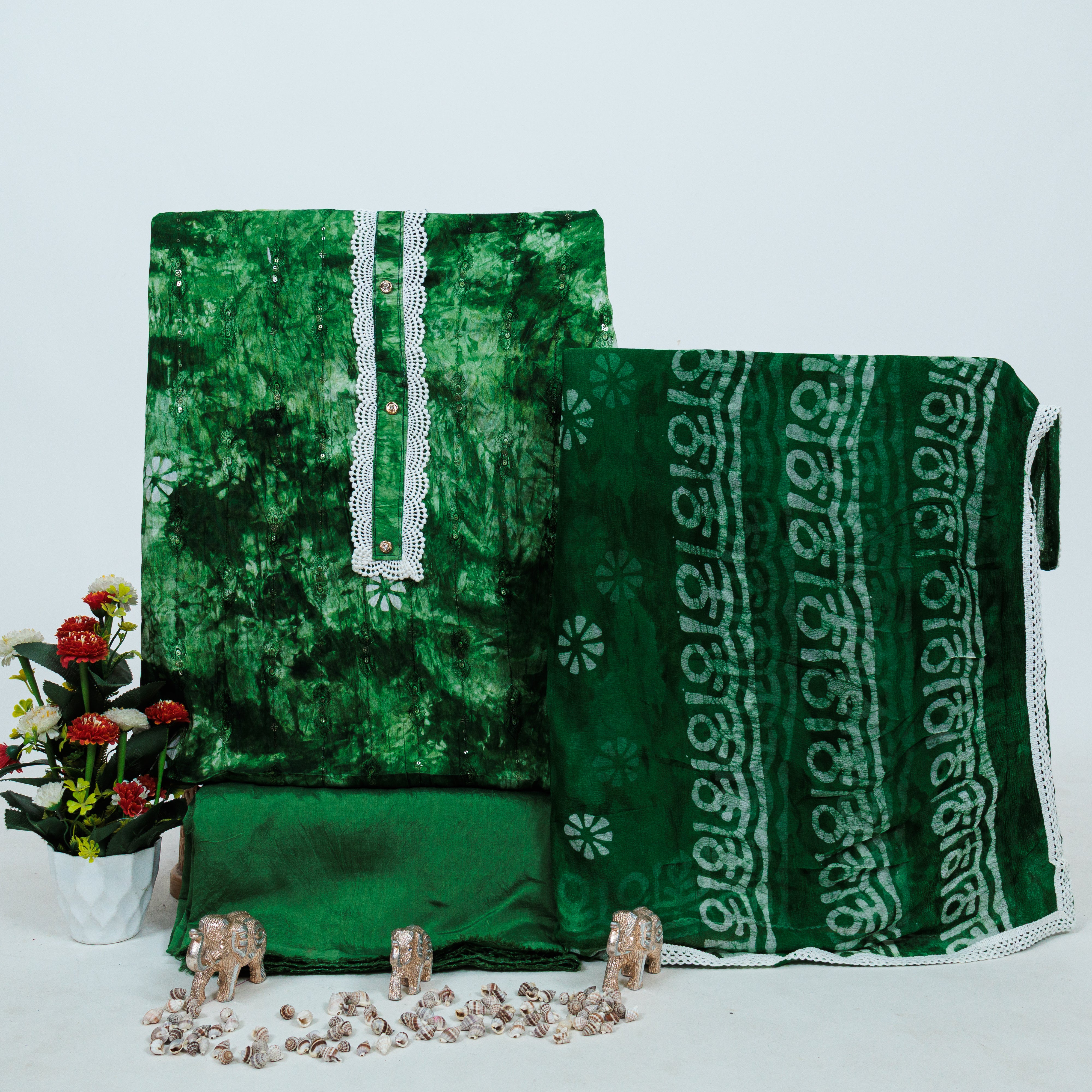 - Fabric Details : Top : Cotton Top with batik print and neck lace || Bottom : Heavy Shantoon || Dupatta : Chiffon dupatta with batik print and lace borders