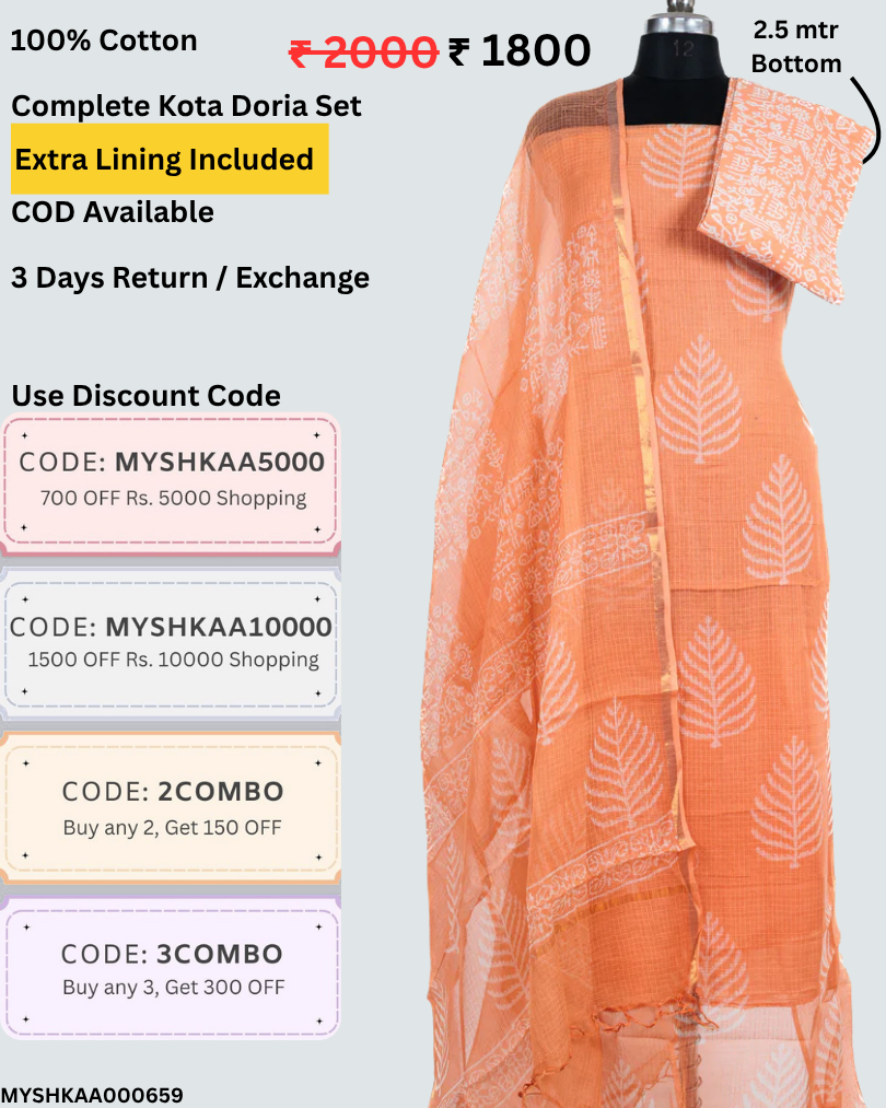 Hand block kota doria suit set for office wear (with extra lining included)