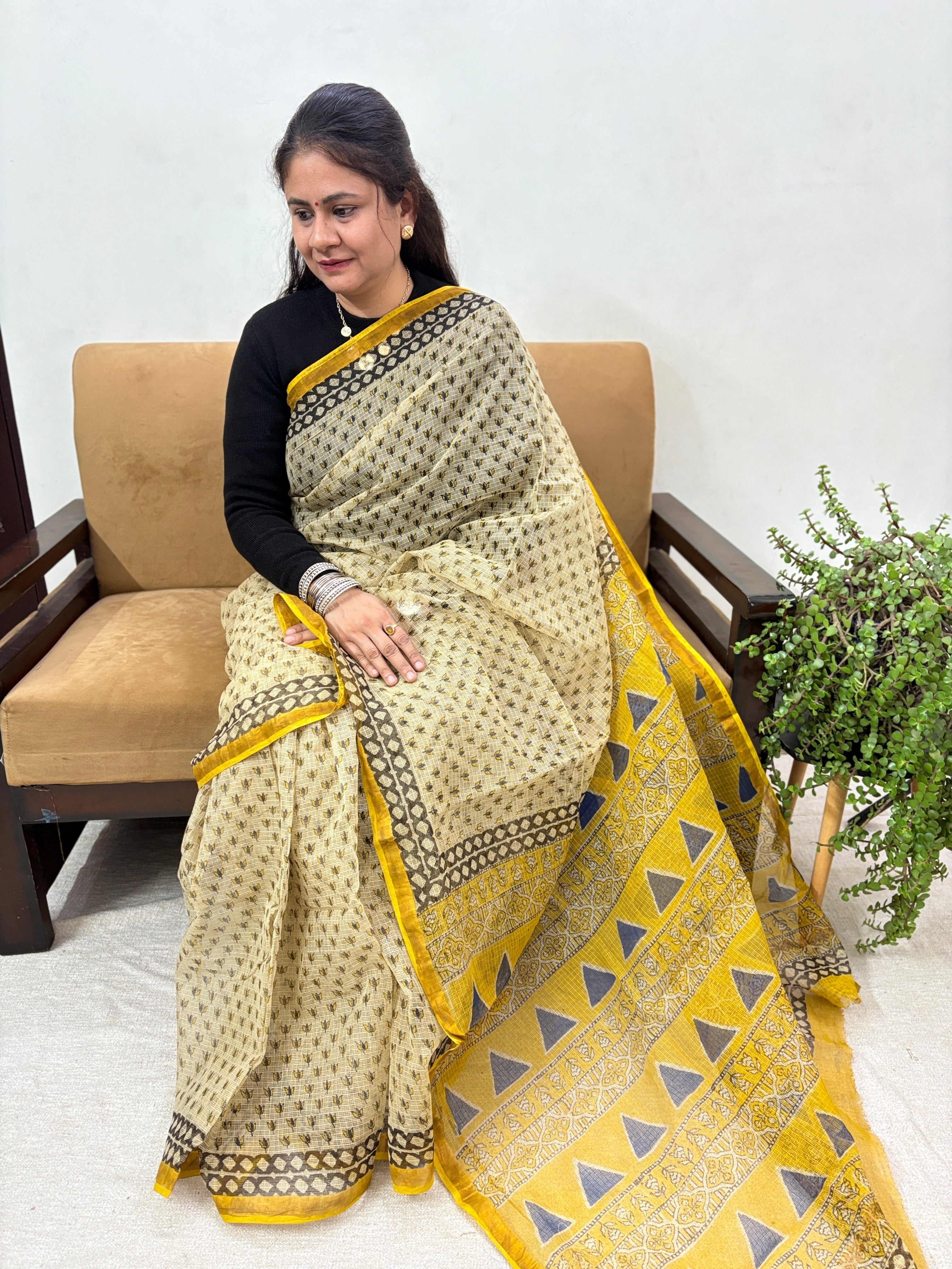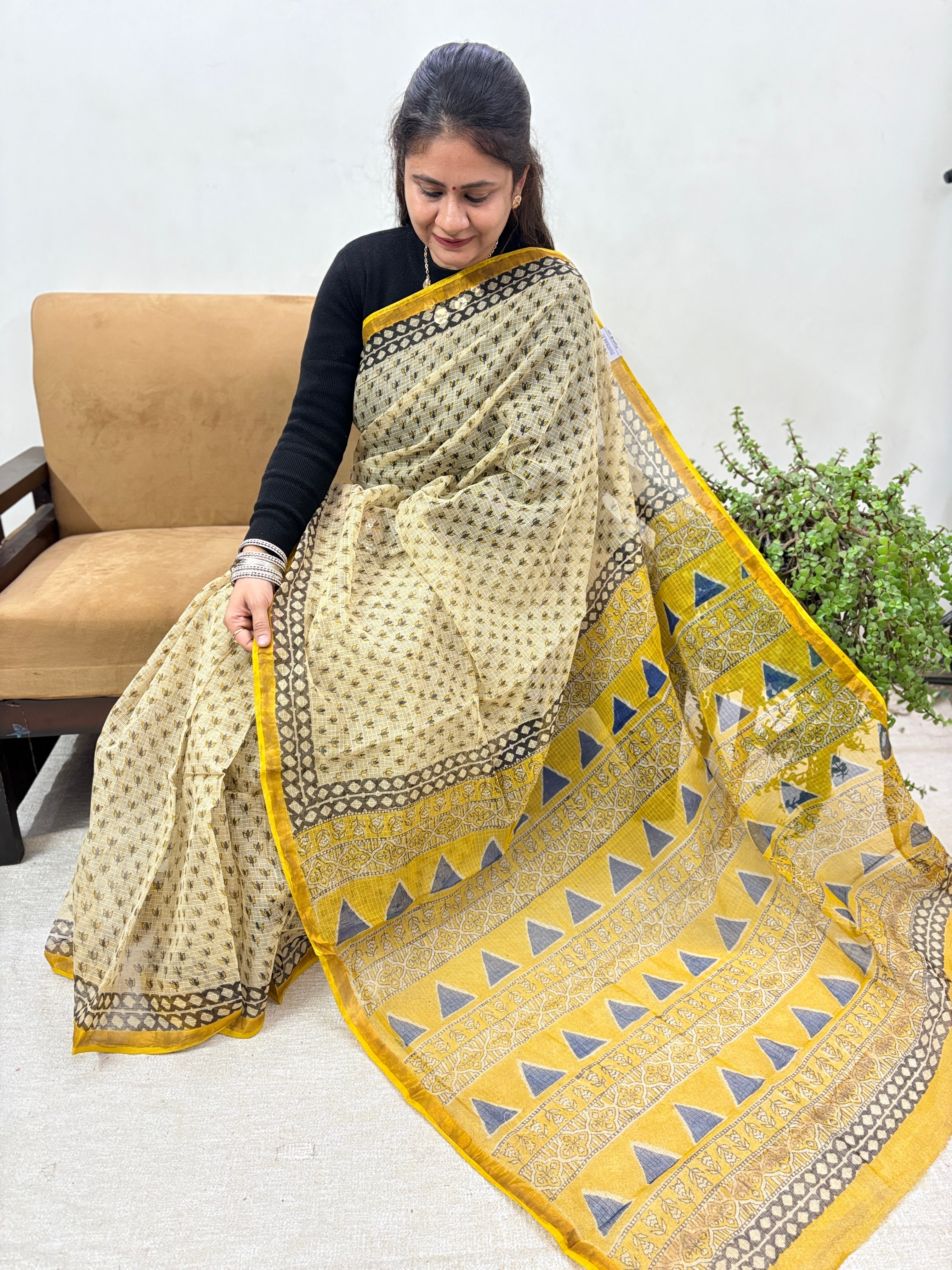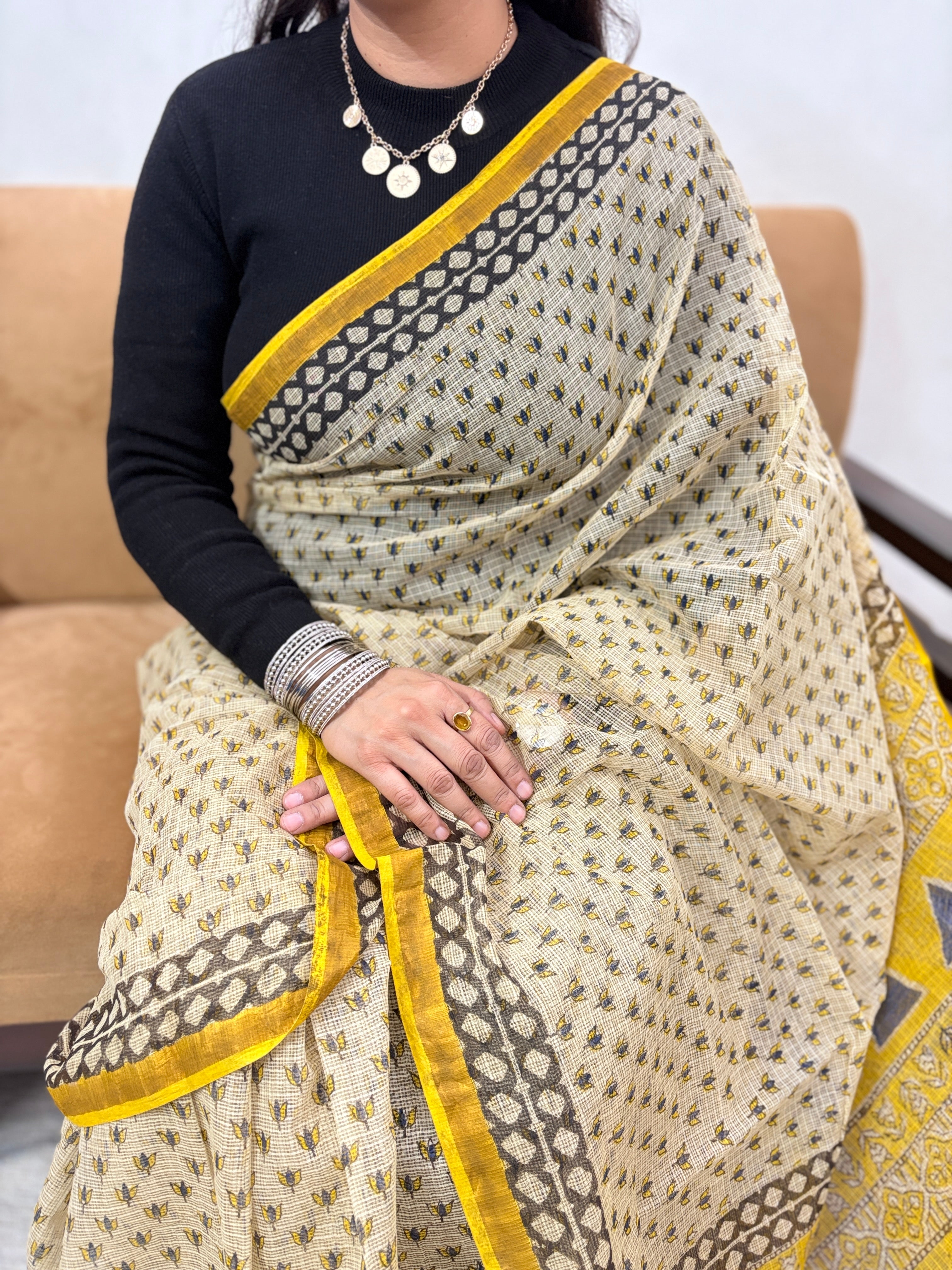 Ajrakh Handblock Print Kota Doria Cotton Saree with Zari Border and Unstitched Blouse Piece(Lining Included)