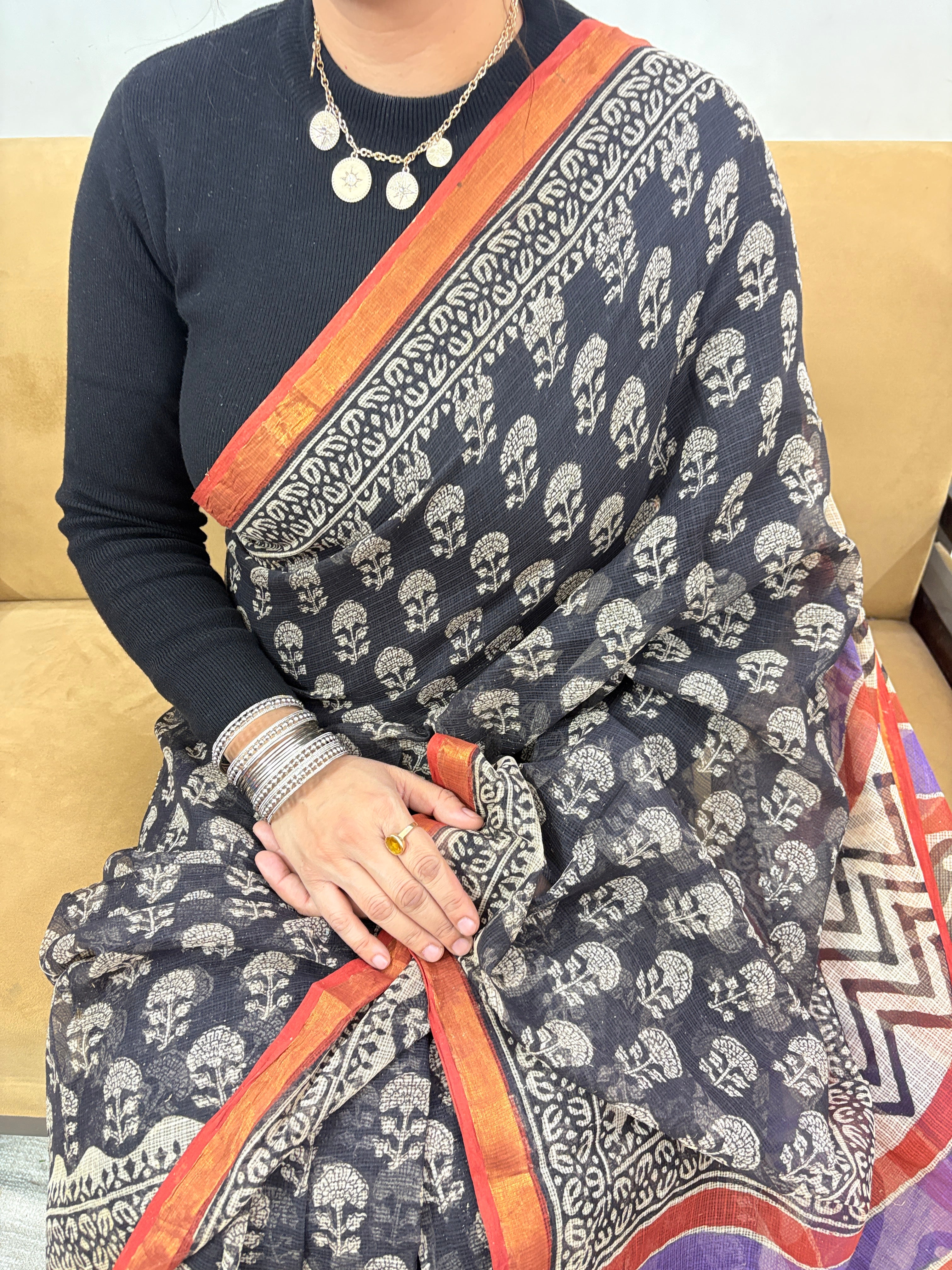 Handblock Print Kota Doria Cotton Saree with Zari border and Unstitched Blouse Piece(Lining Included)
