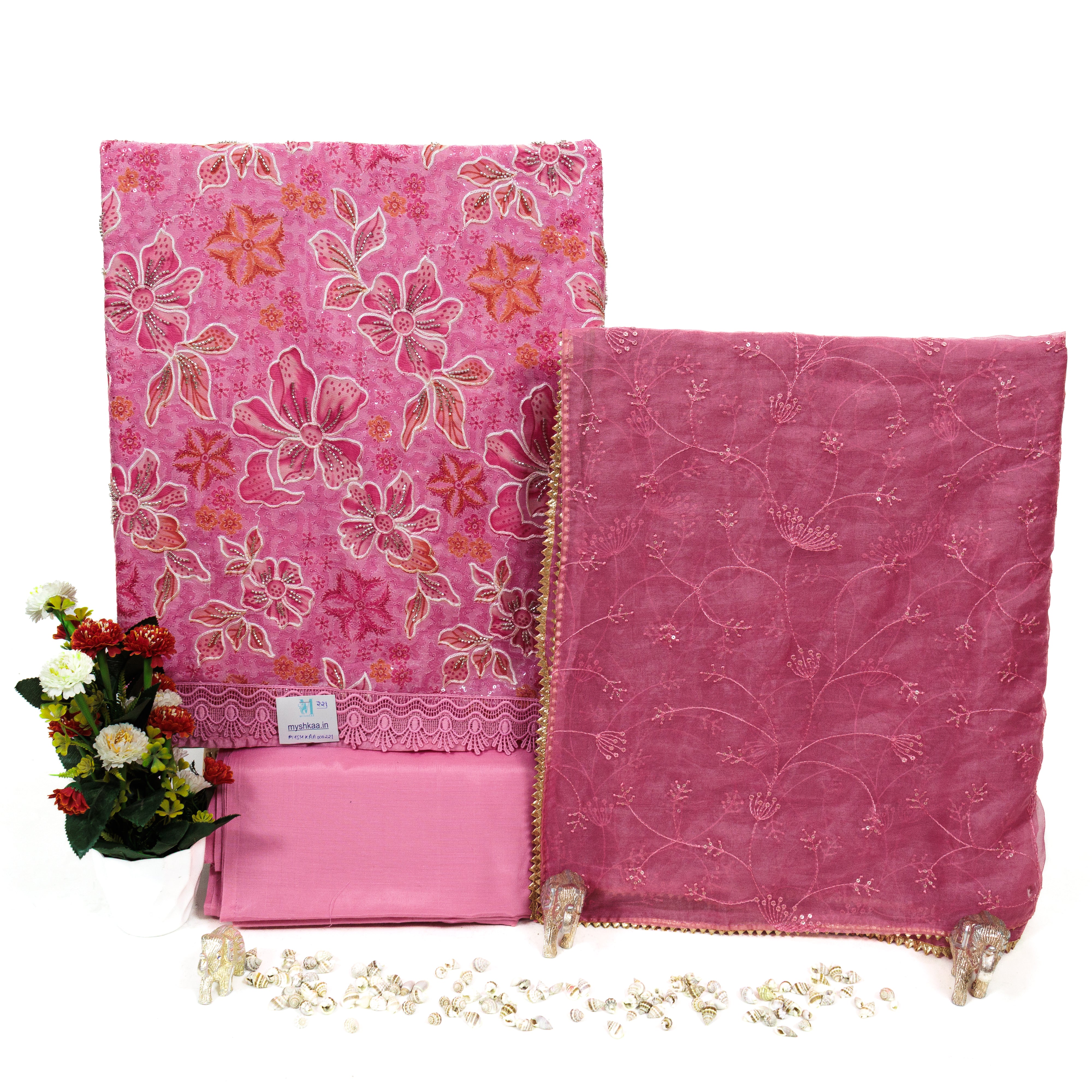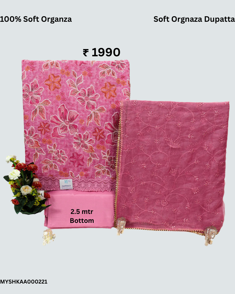 Pink Party Wear Organza Suit fabric with Neck embroidery and dupatta