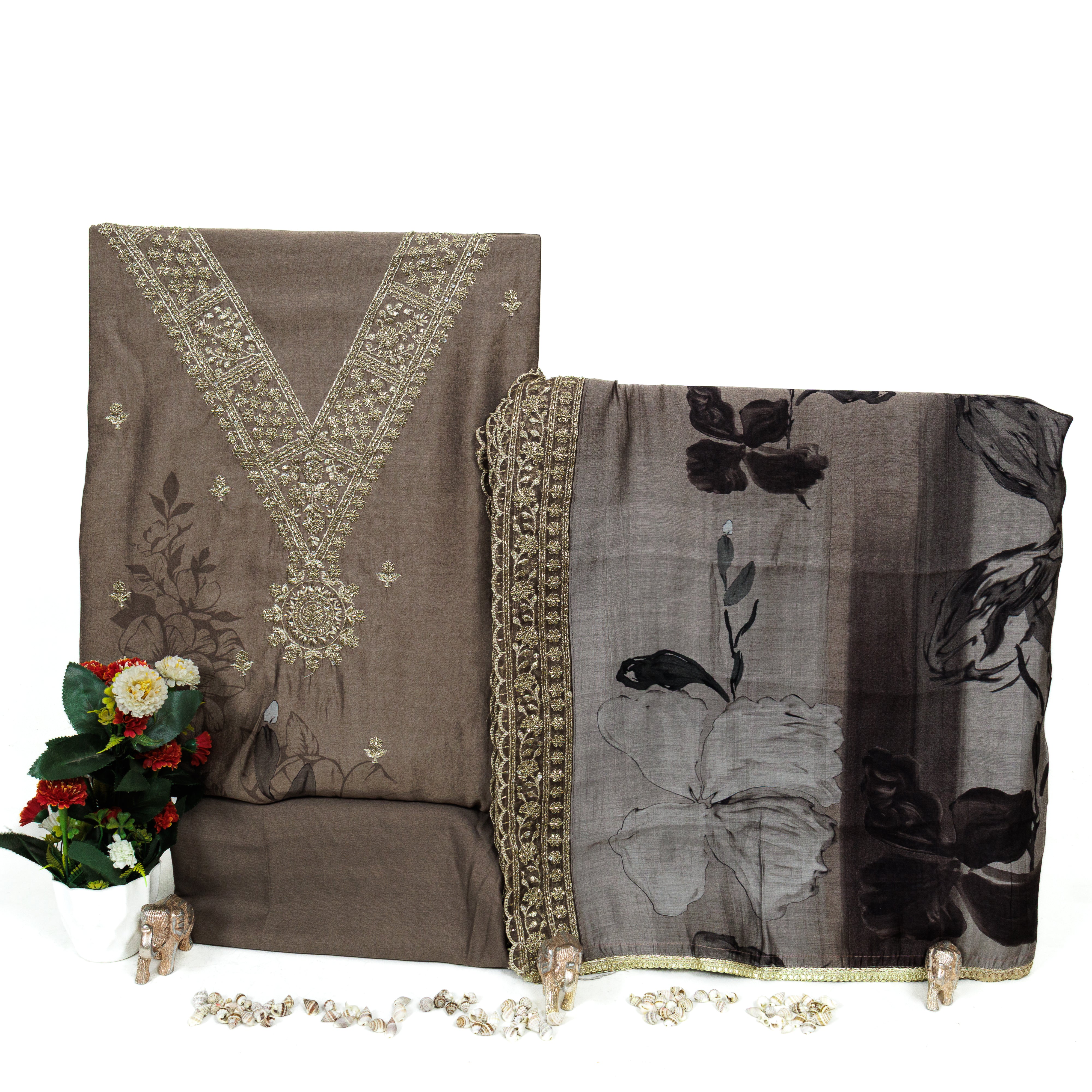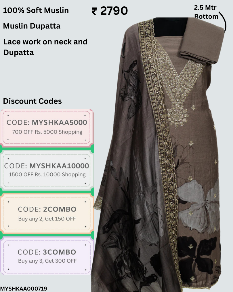 Get the perfect professional look with our Muslin Office Wear Suit Fabric. Made from high quality muslin, this suit fabric not only provides a comfortable fit, but also exudes elegance and style. The included muslin dupatta adds a touch of sophistication, making it the perfect outfit for any office setting. Upgrade your work wardrobe with our muslin suit fabric today.