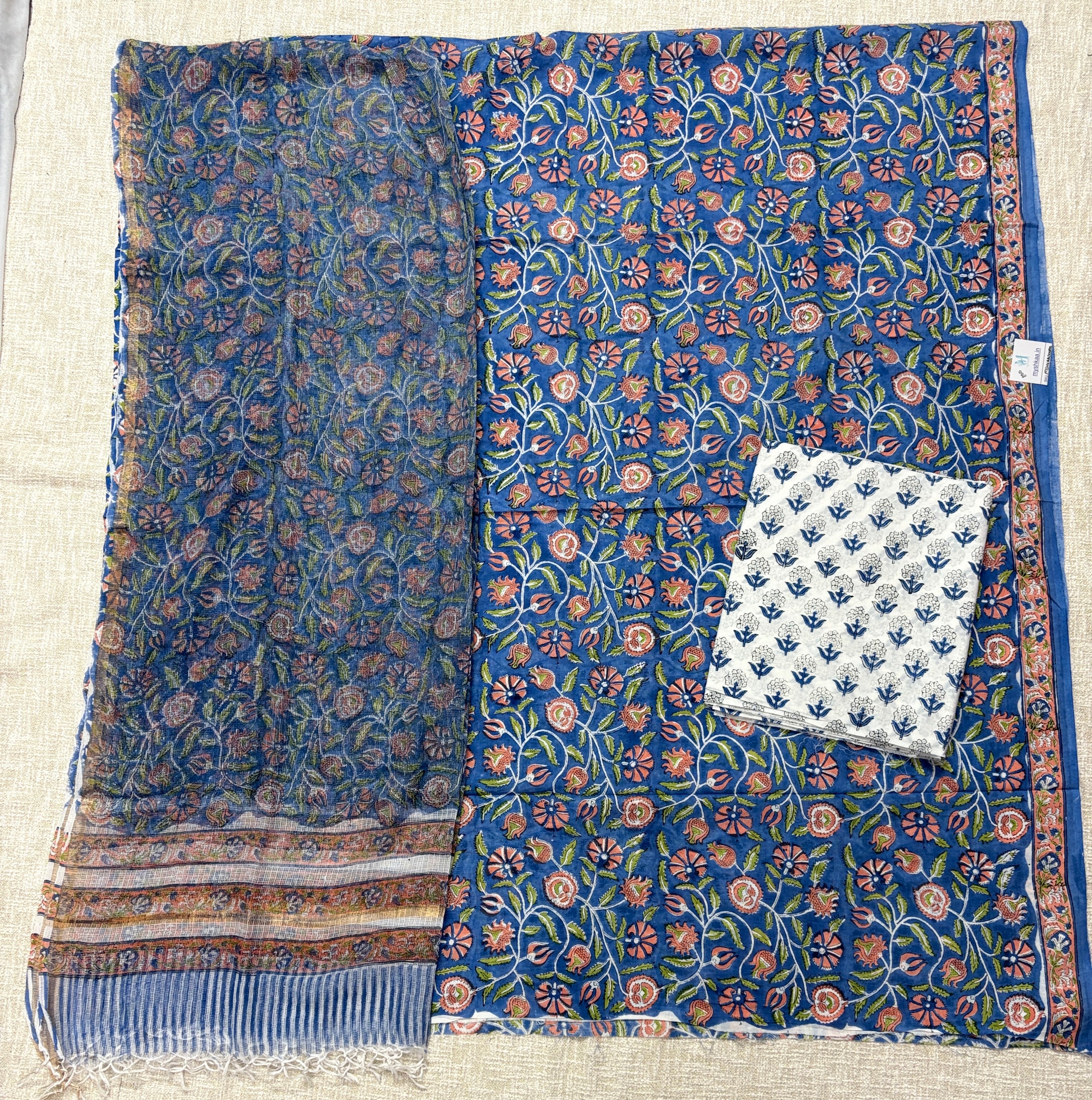 Blue Cotton Handblock Office Wear Suit fabric with Kota Doria Dupatta
