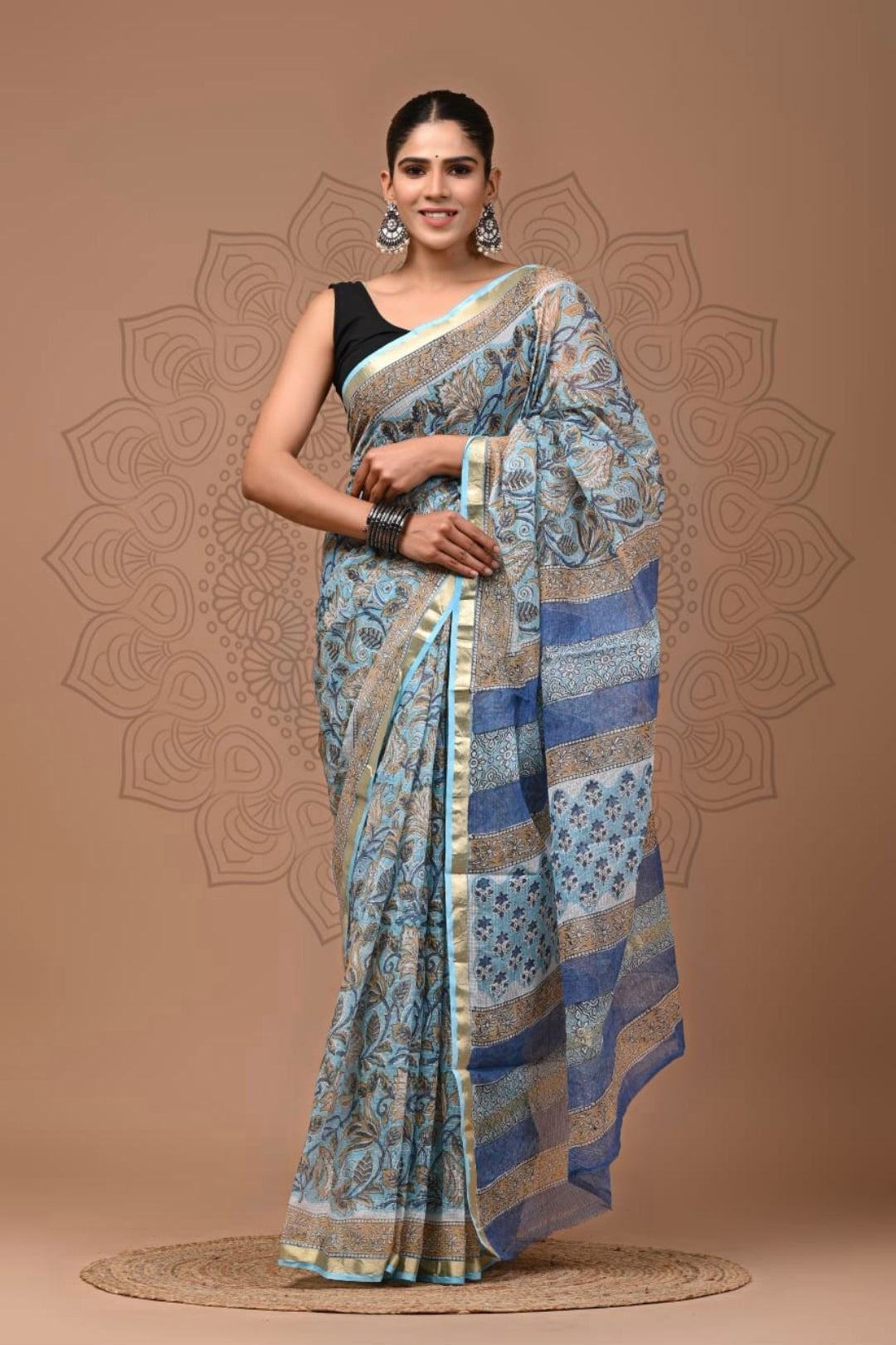 This exquisite Kota Doria Cotton Saree embodies timeless elegance, making it ideal for festivals and special occasions. This saree features a floral and geometric pattern all over the length.