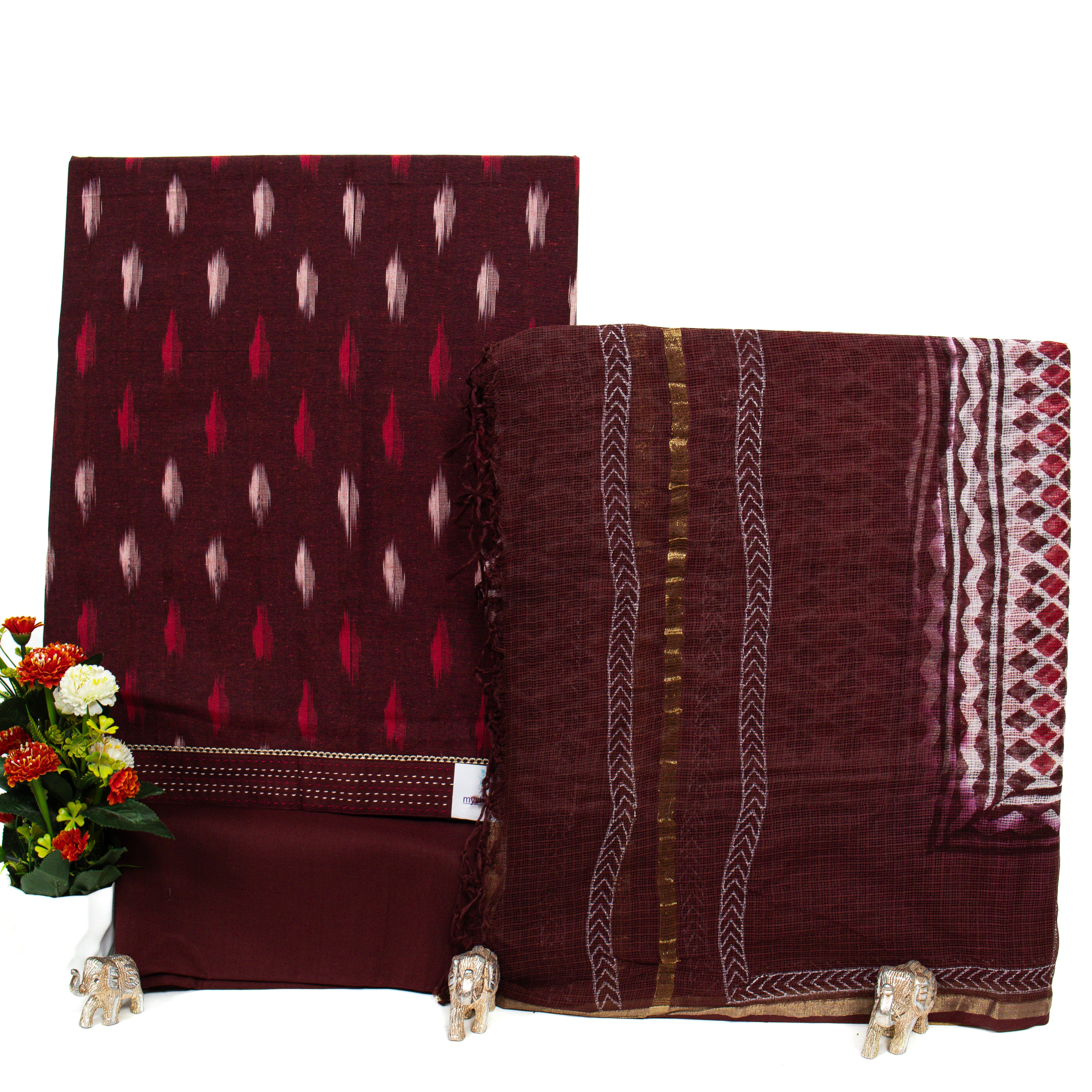 - This 3 piece Maroon Cotton Ikkat Handloom Office Wear Suit with Kota Doriya dupatta is a perfect gift for women and girls for all occasions. It can be used at functions, ceremonies or official purposes.