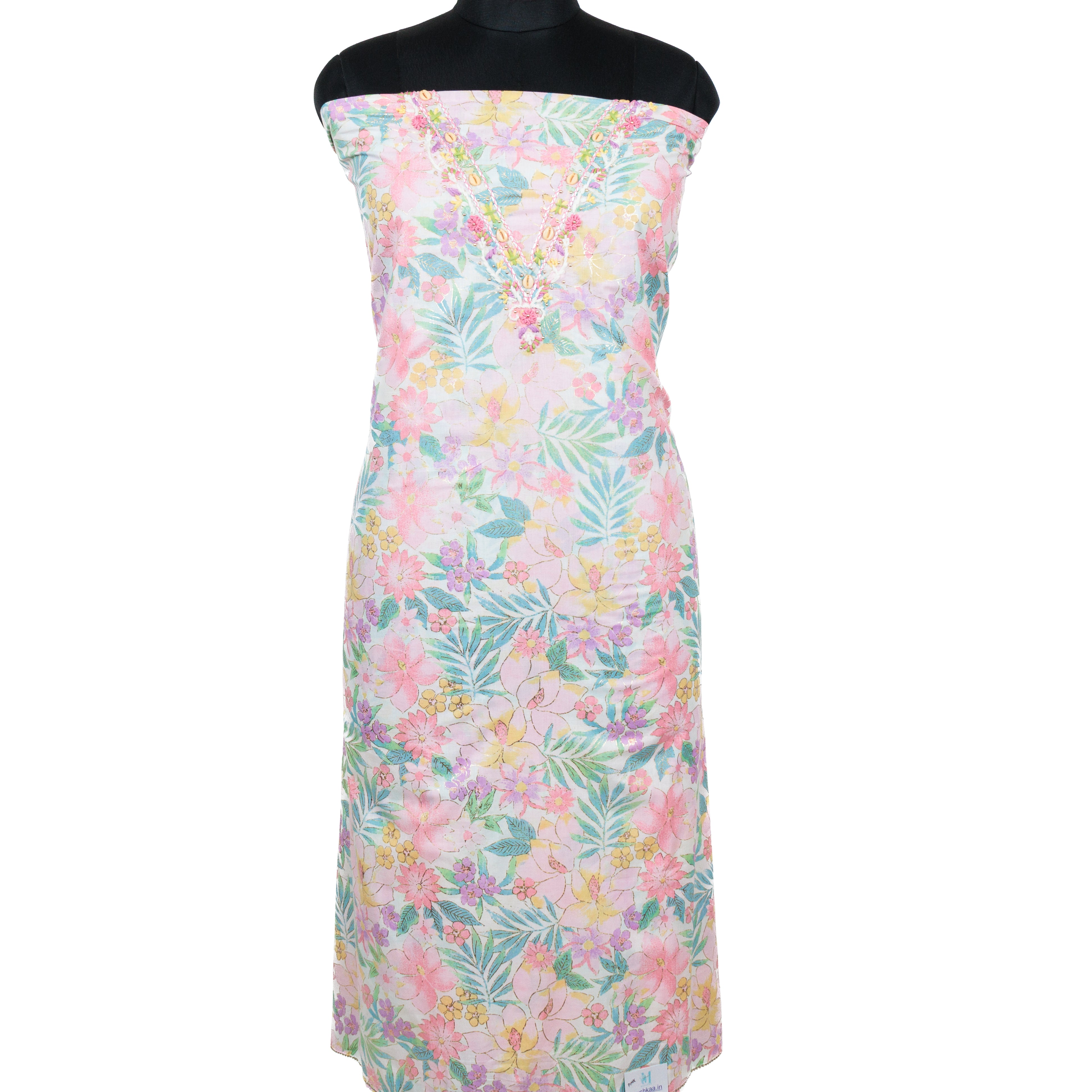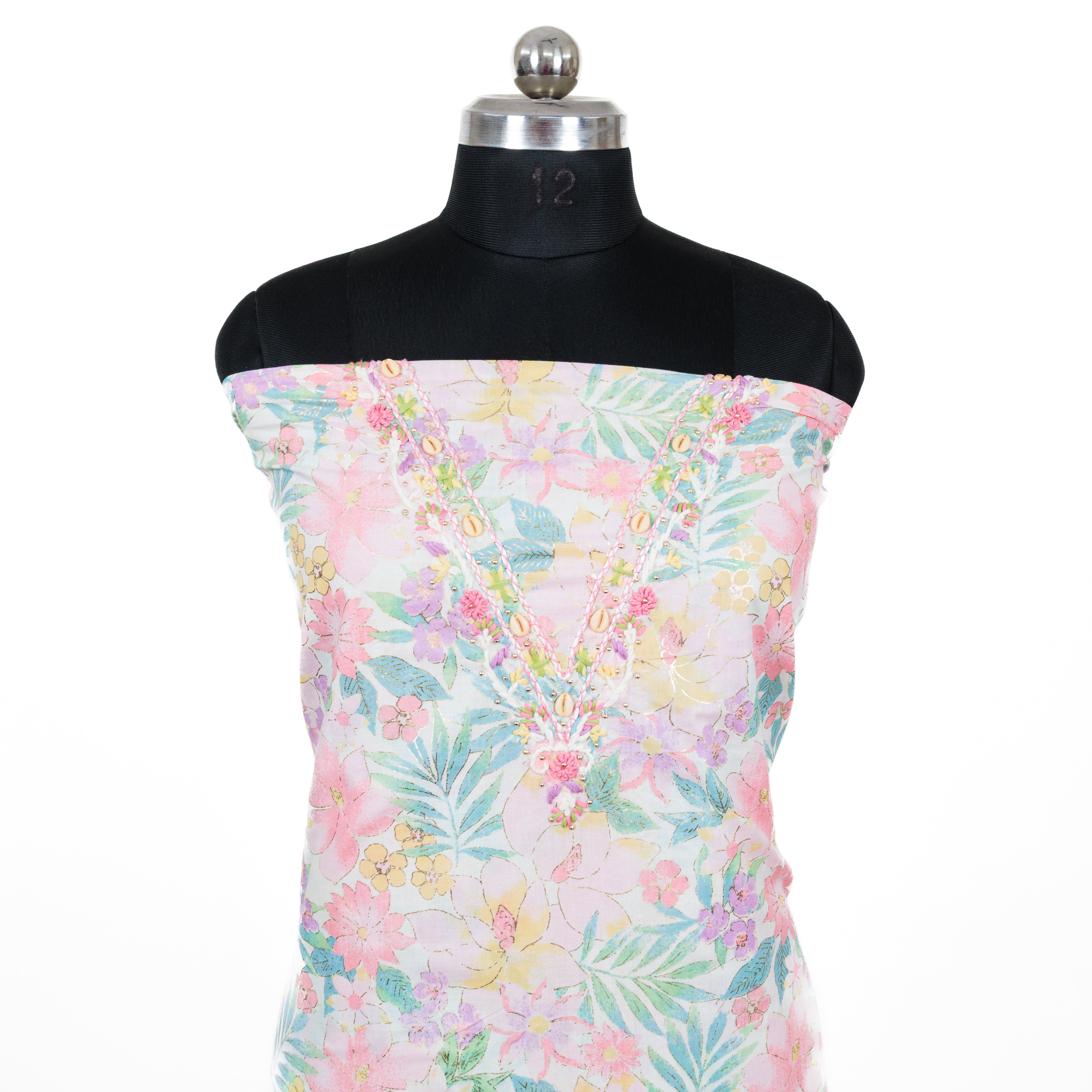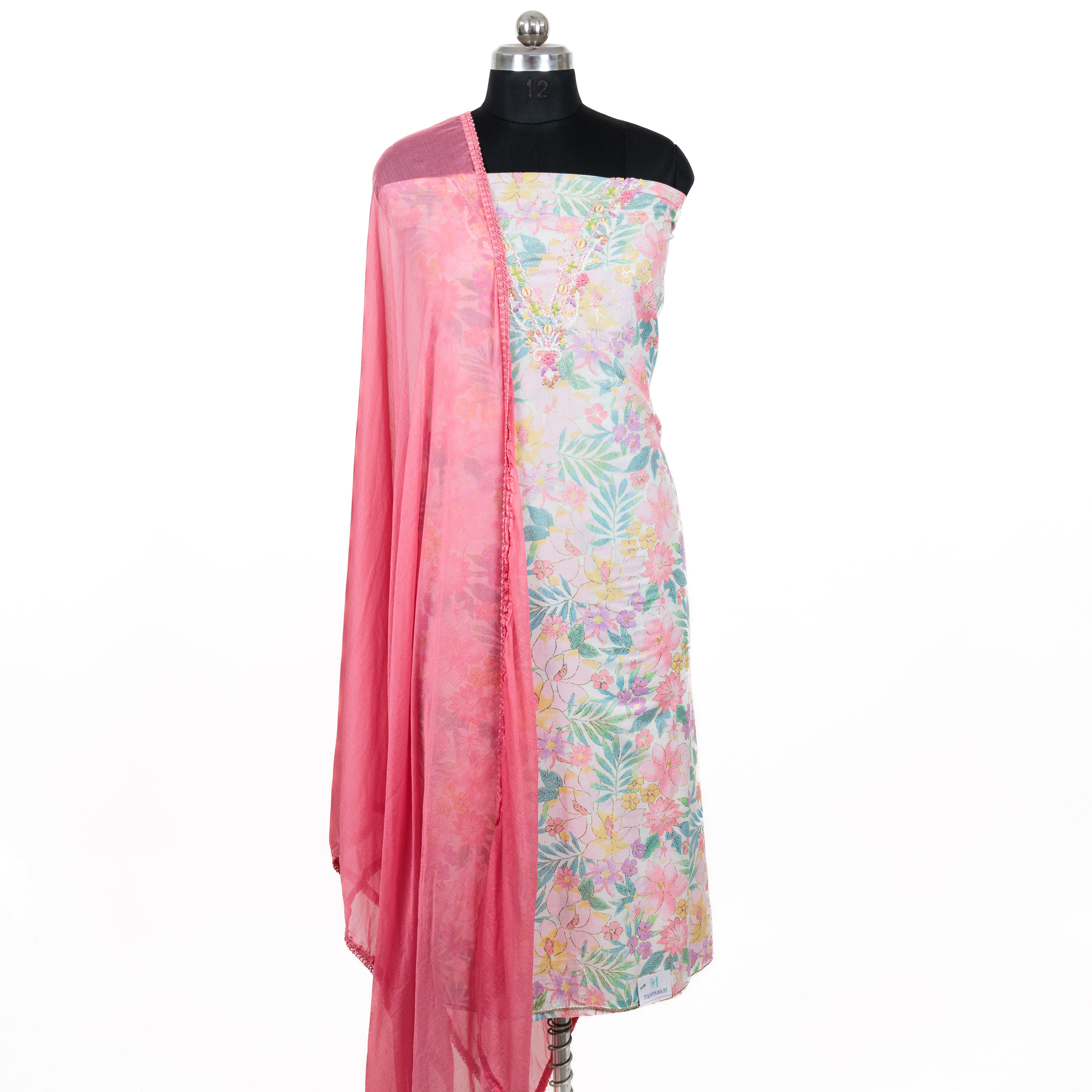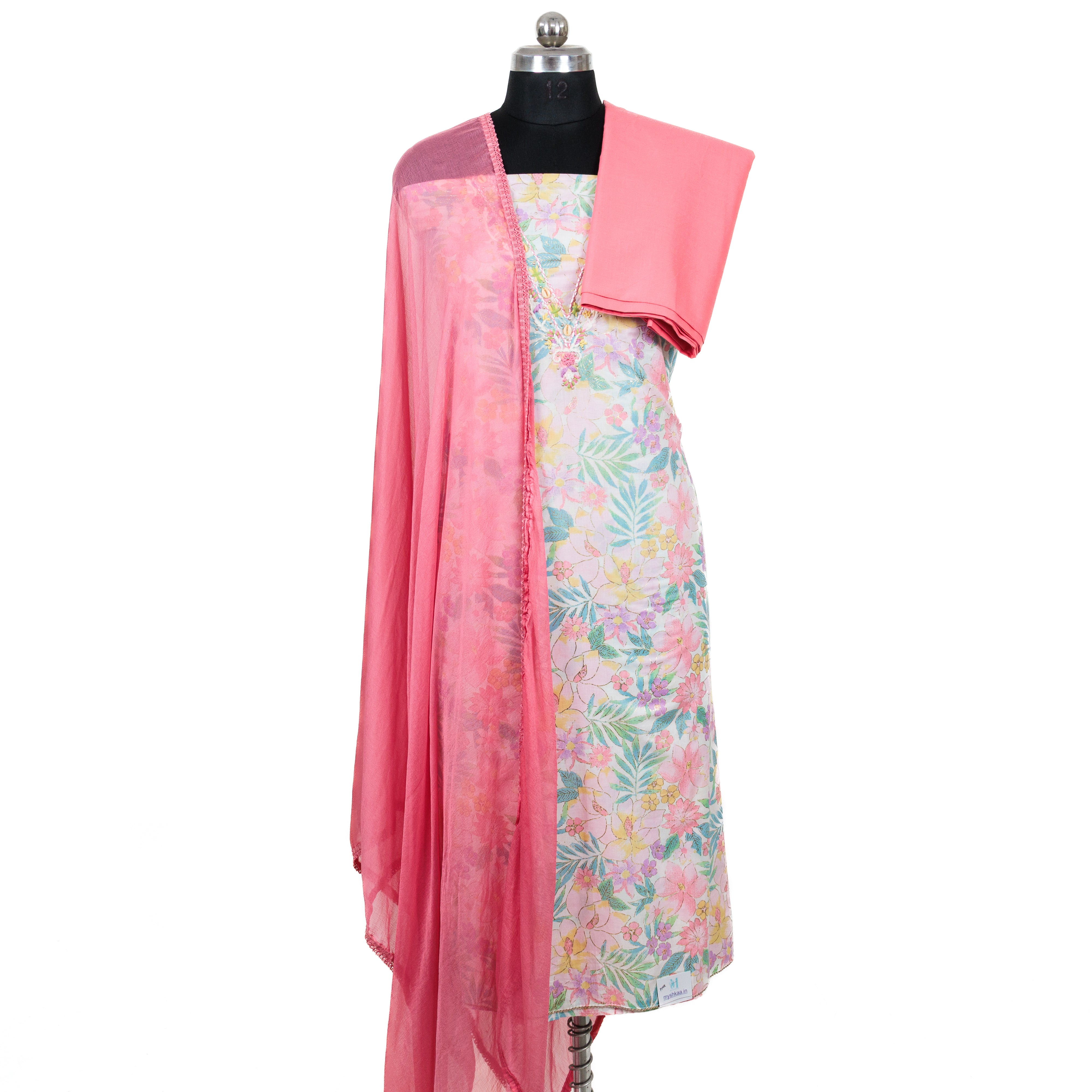 - Fabric Details : Top : Pure Cambric Cotton with embroidered neck || Bottom : Cotton || Dupatta : Chiffon Dupatta with lace borders