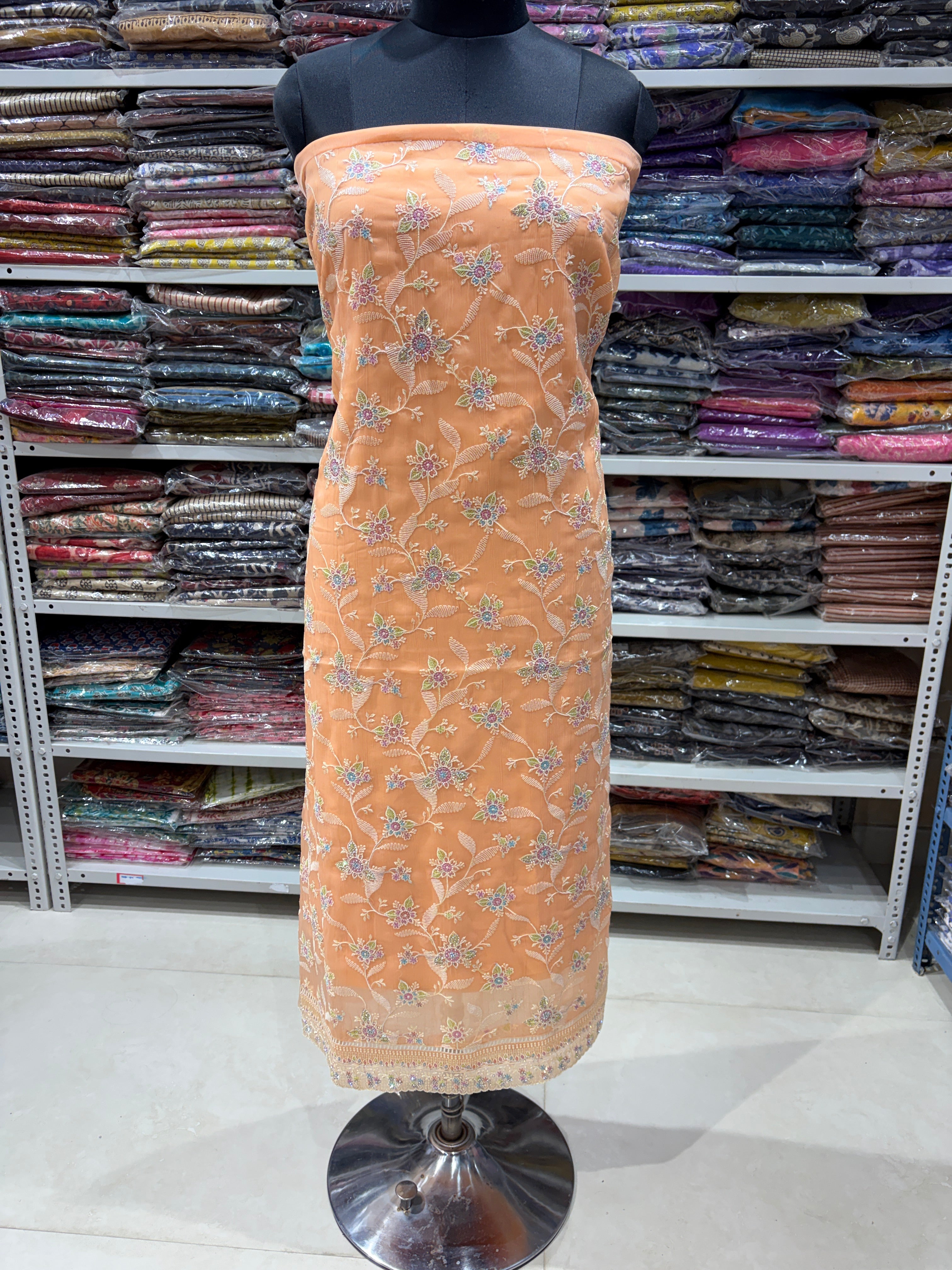 - Peach Wrinkled Organza Party Wear Designer Suit fabric with pure chiffon dupatta