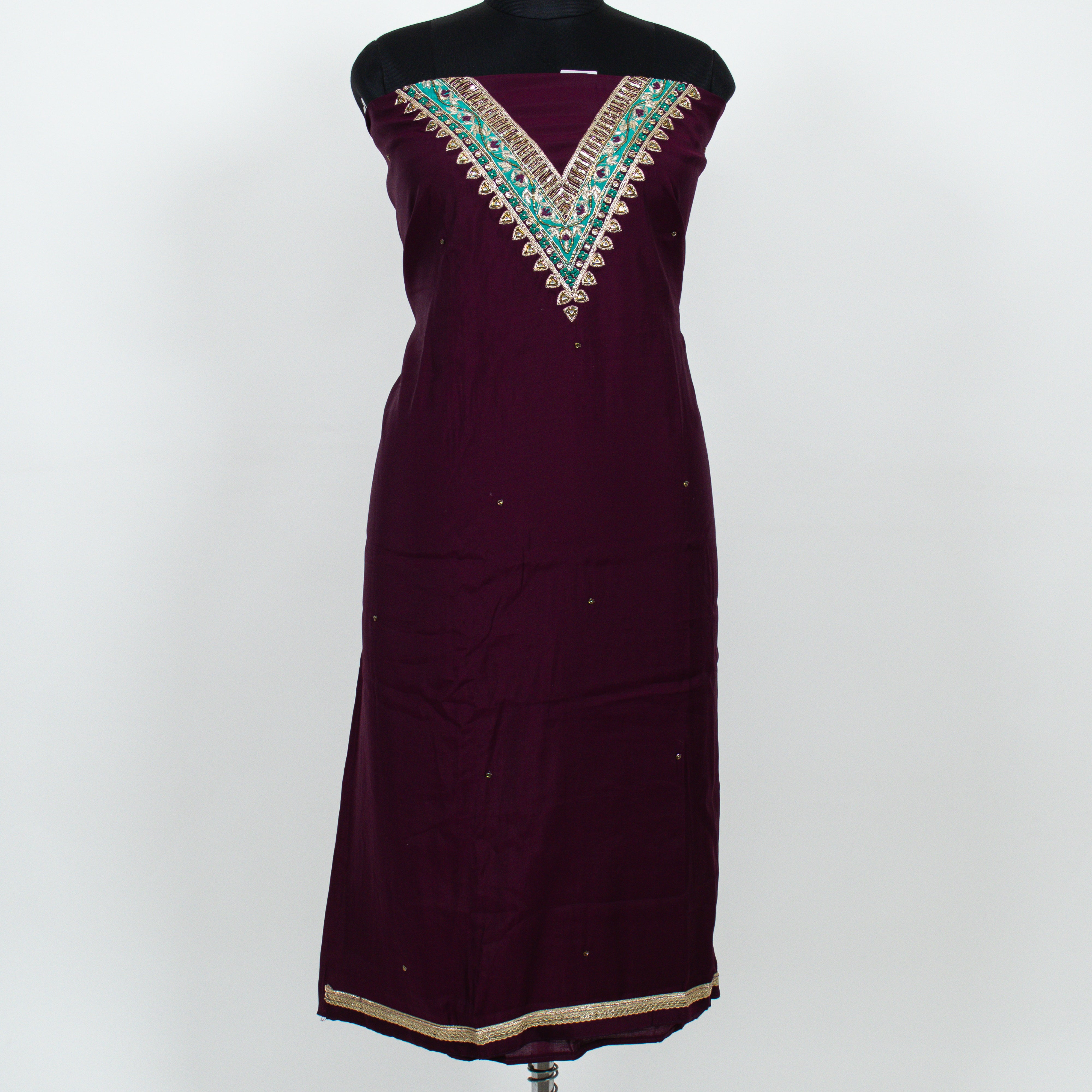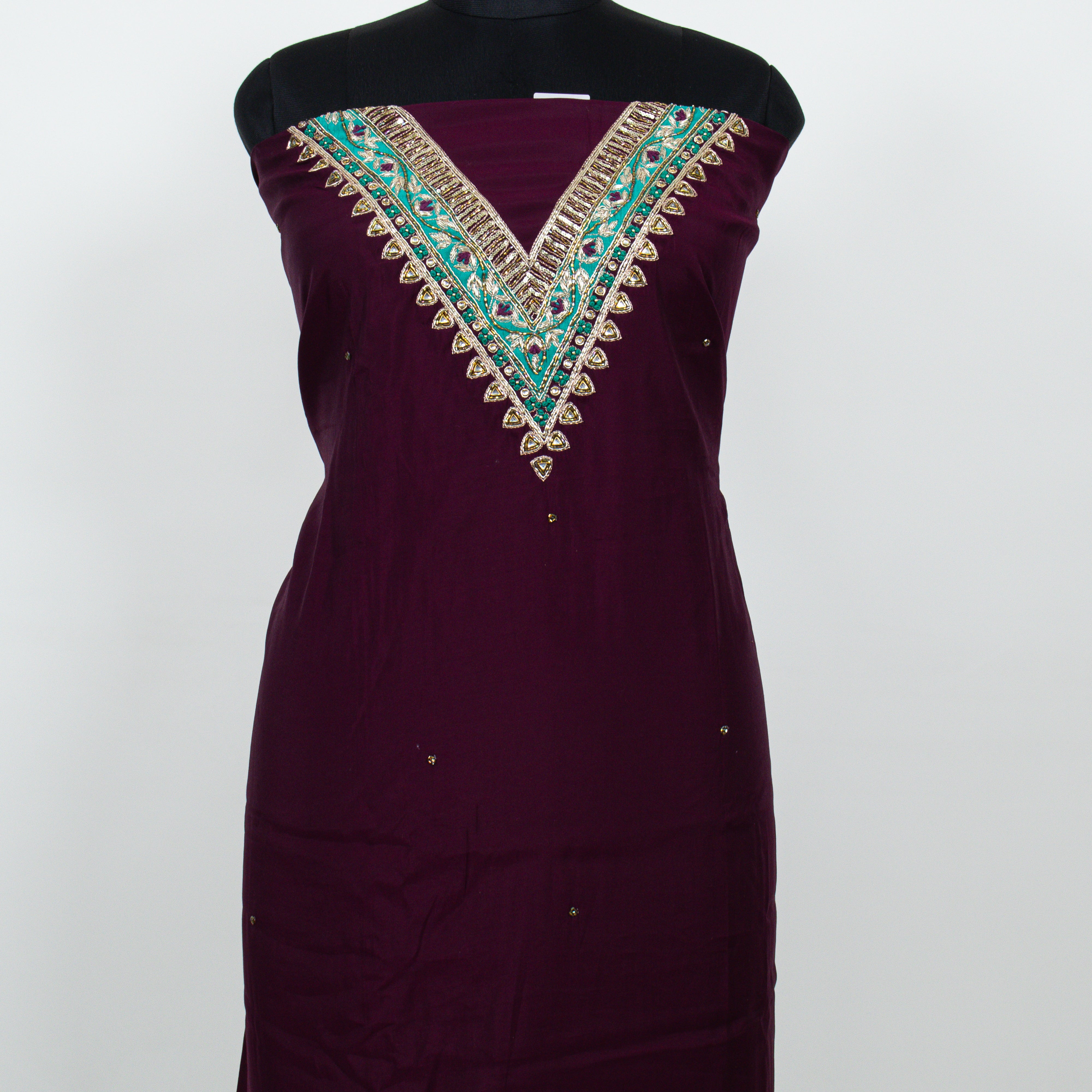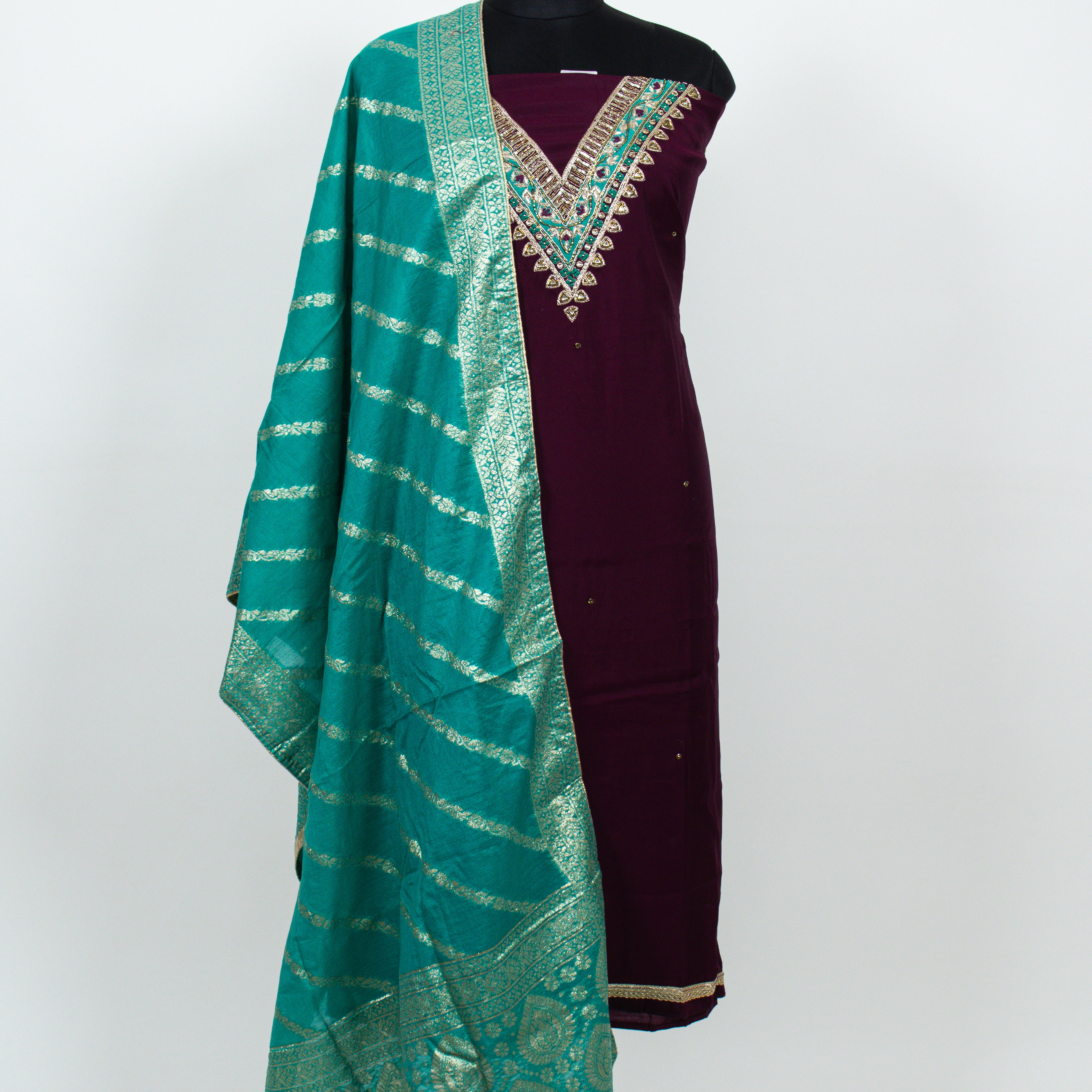 - Wine color Party Wear Designer Suit fabric with embroidery and banarasi dupatta
