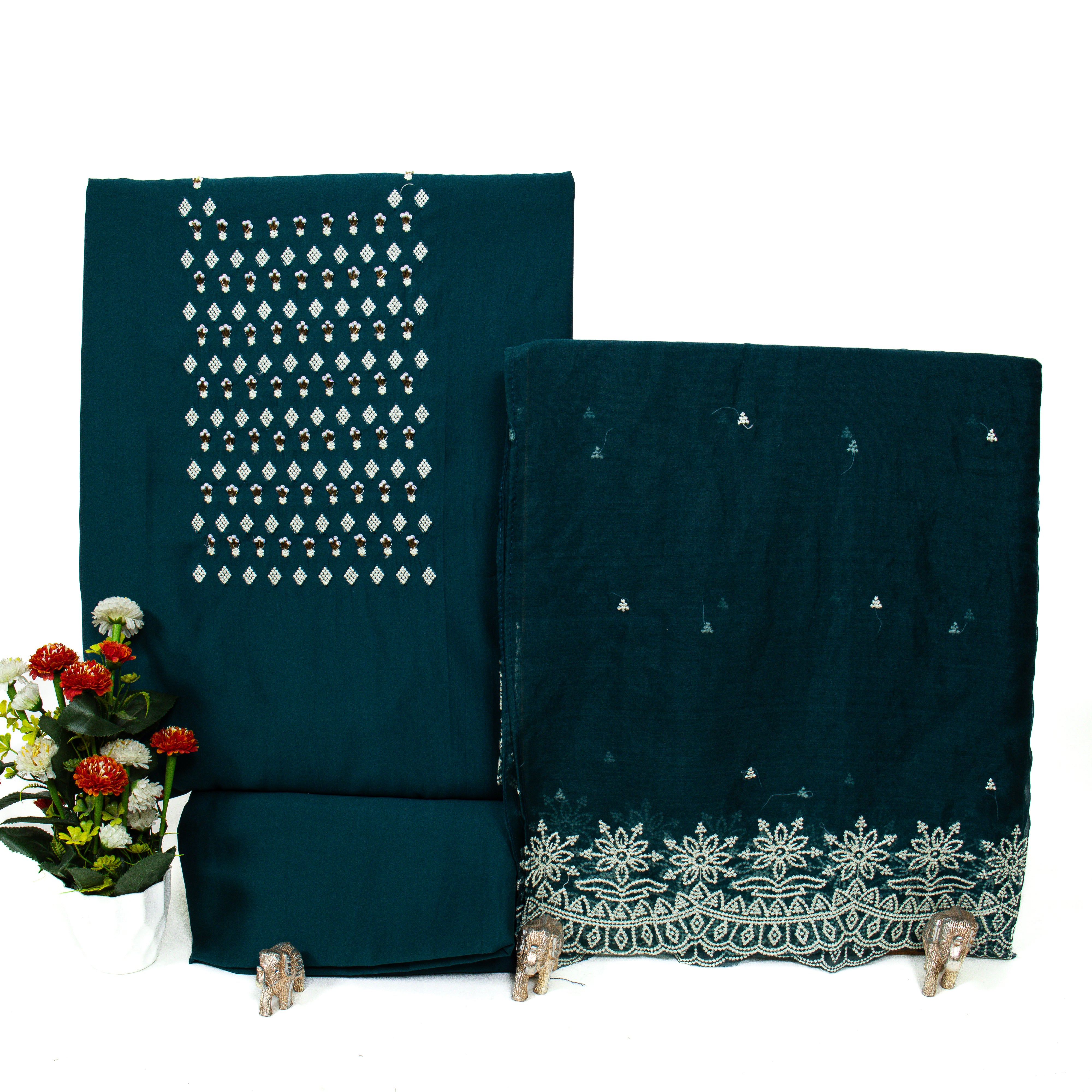 Bottle Green Party Wear Suit with Neck embroidery and organic organza dupatta with lace work