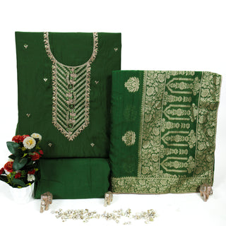 Green Party Wear Suit with Neck embroidery and silk dupatta