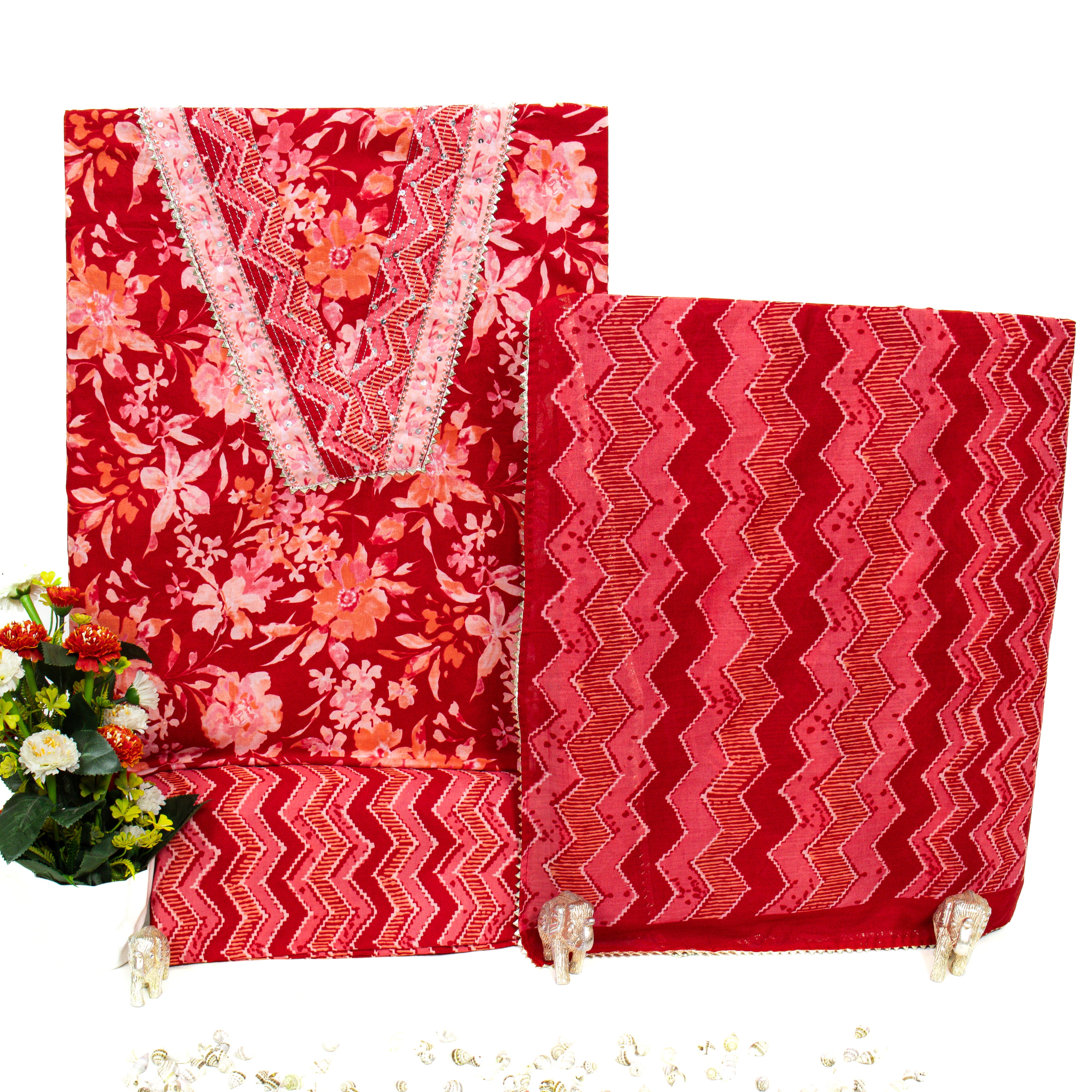 Red Cotton Office Wear Suit Fabric with Cotton Dupatta