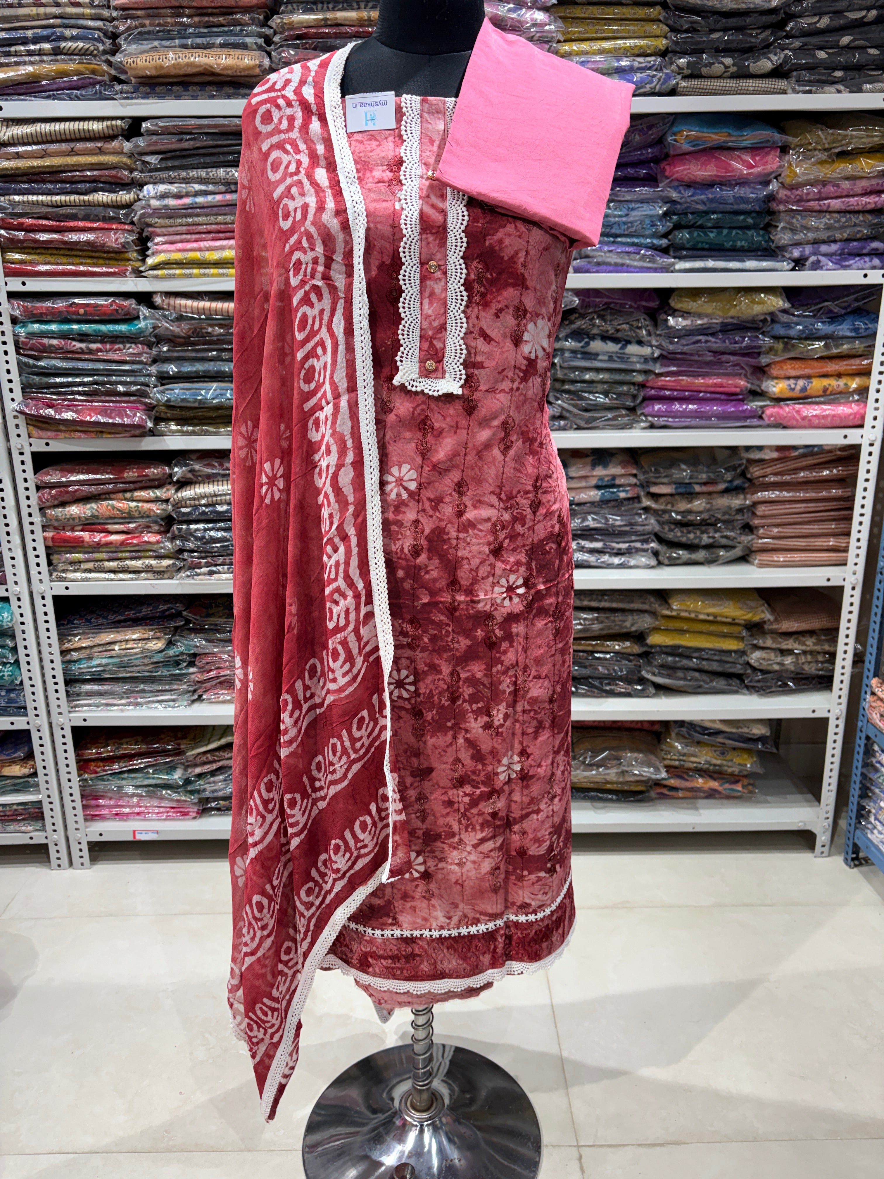- Fabric Details : Top : Cotton Top with batik print and neck lace || Bottom : Heavy Shantoon || Dupatta : Chiffon dupatta with batik print and lace borders