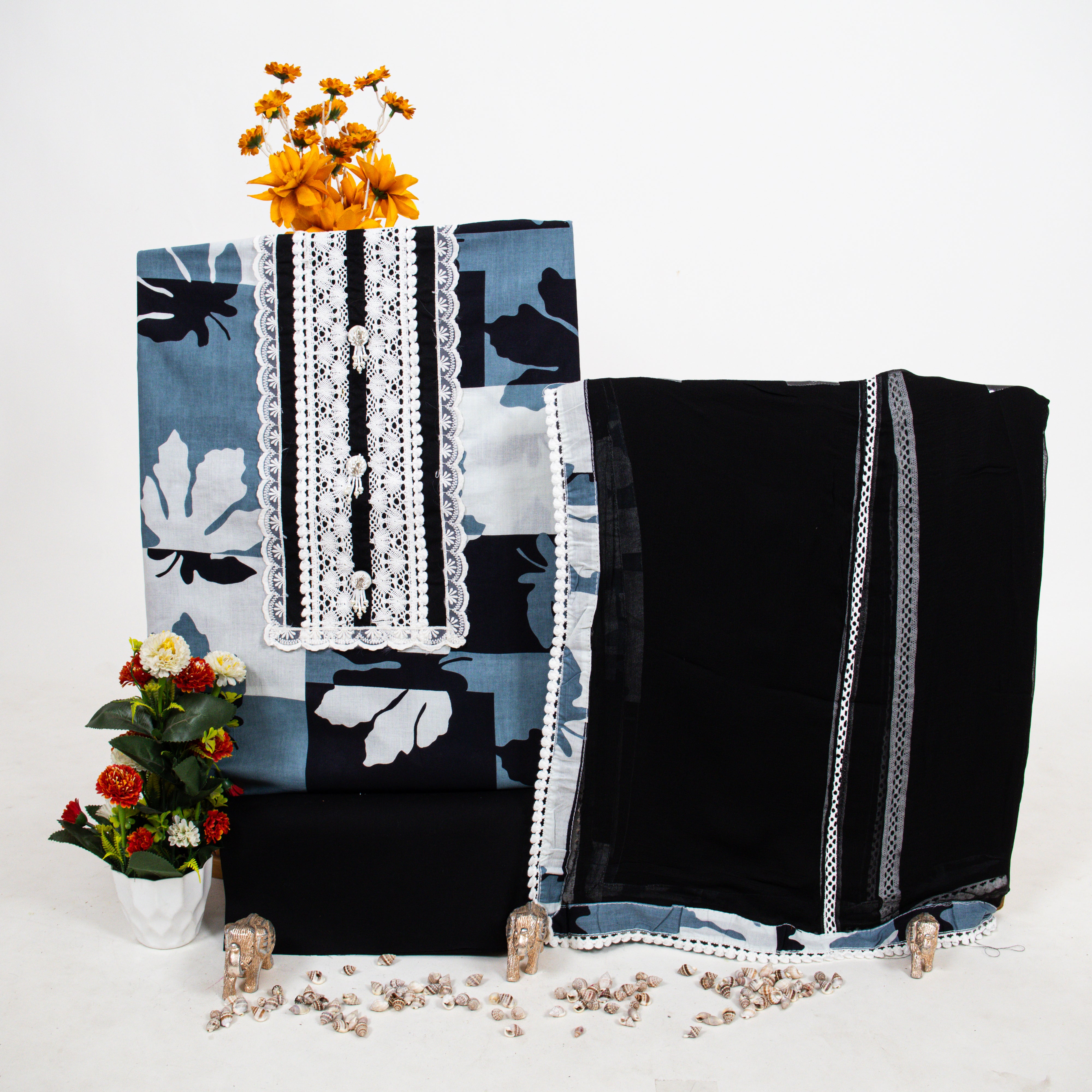 - Black Office Wear Lace Work Suit fabric with Chiffon Dupatta