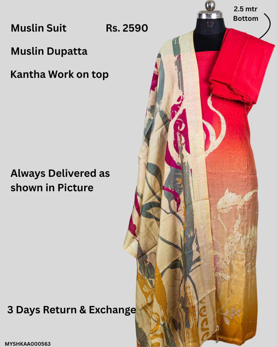 Muslin Party Wear Suit Fabric with katha work and printed muslin dupatta