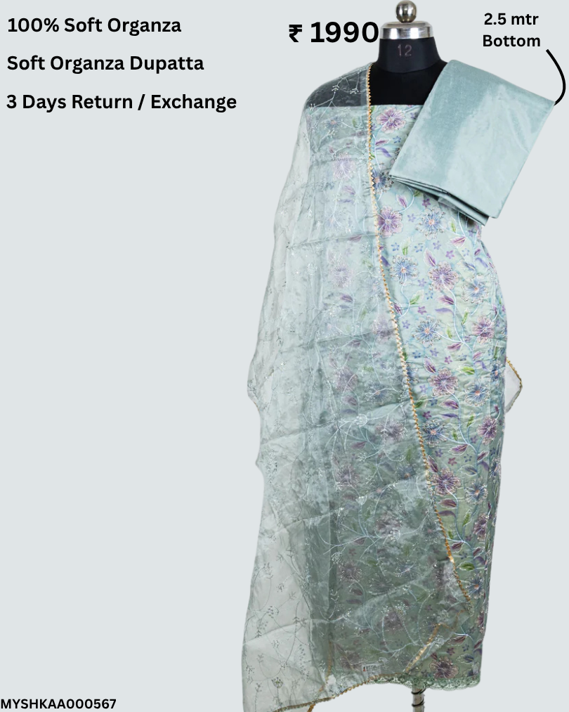 Blue Firozi Organza Party Wear Suit Fabric with embroidery organza dupatta