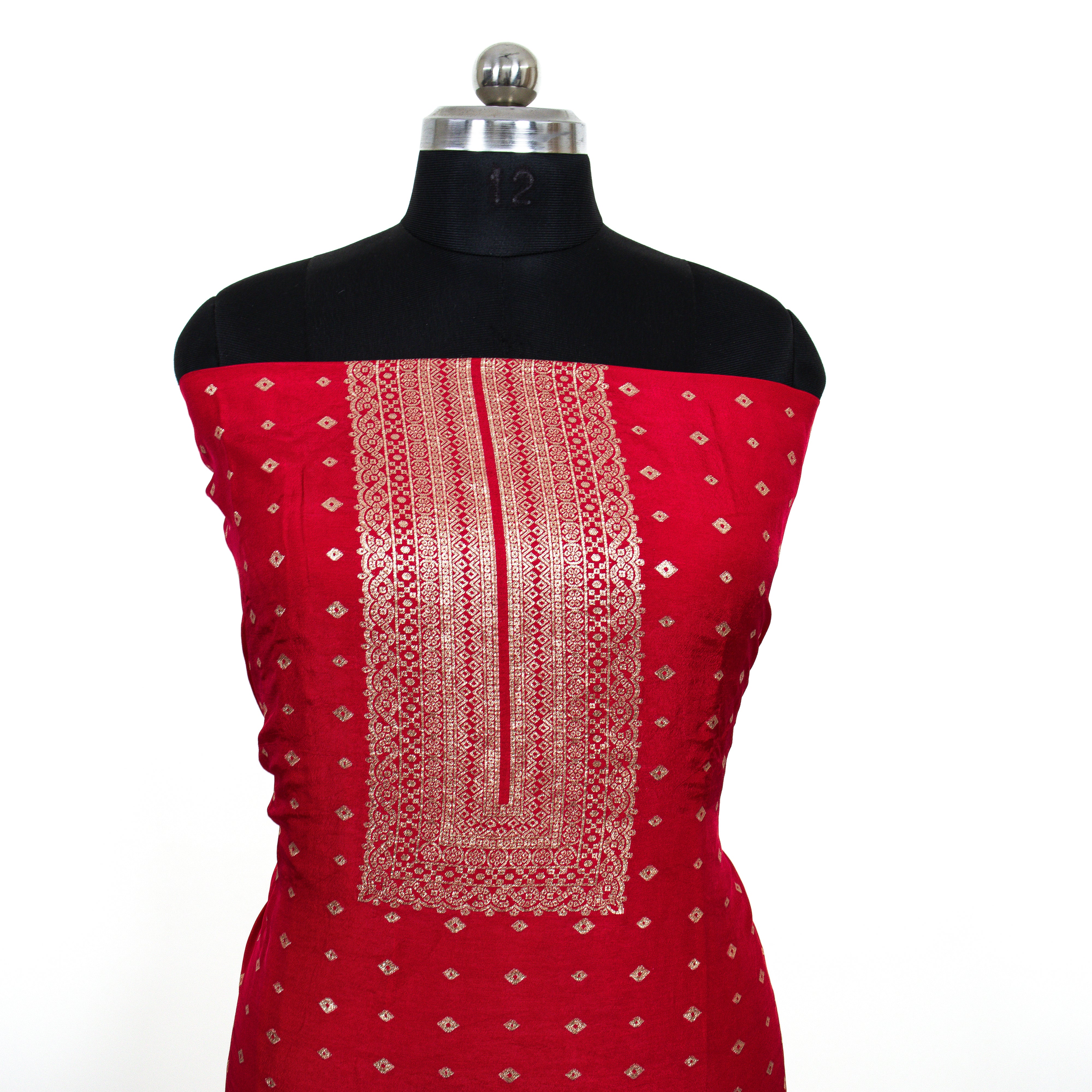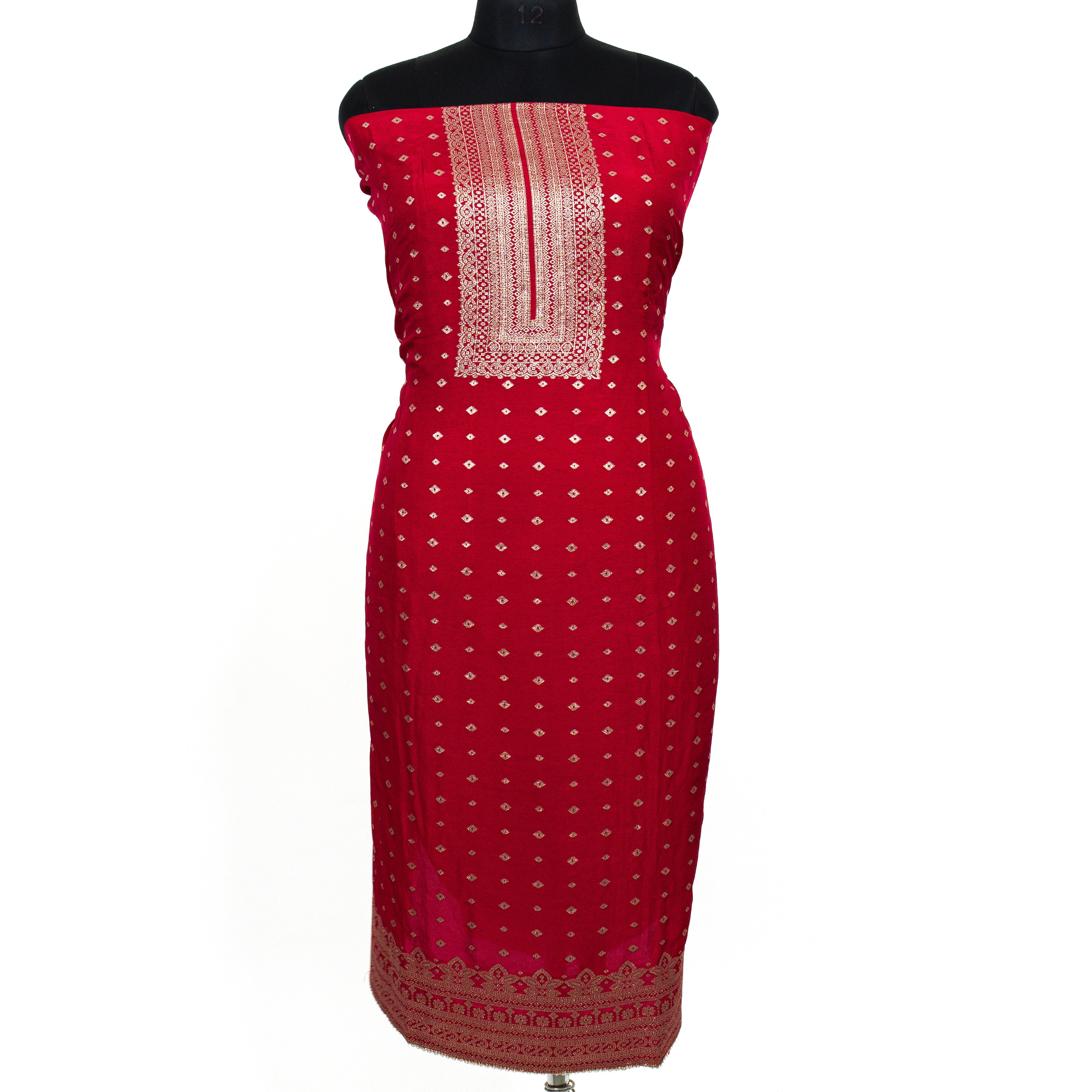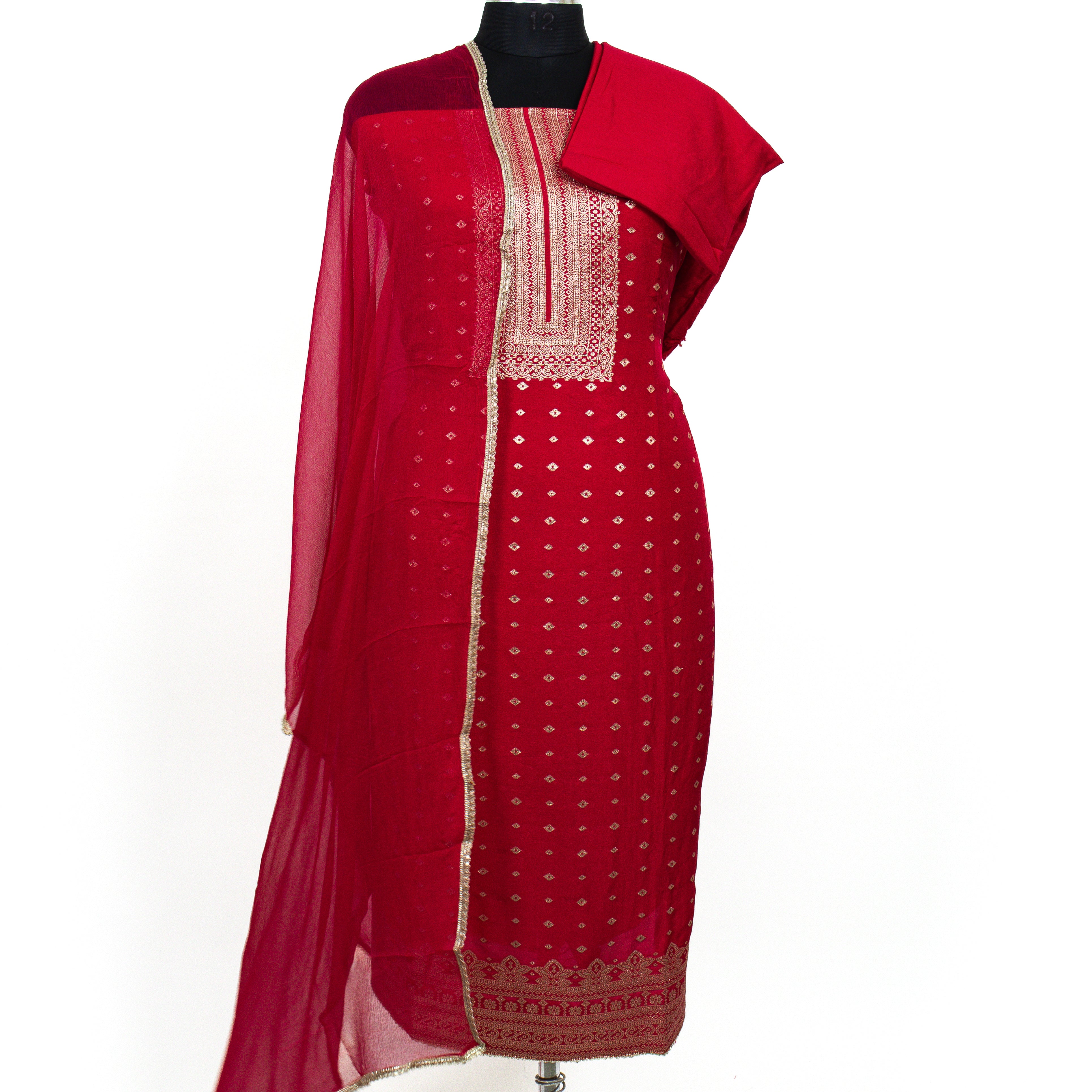 - Red Color Dola Silk Party Wear Designer Suit fabric with chiffon dupatta